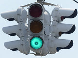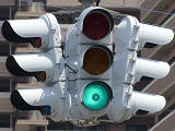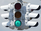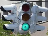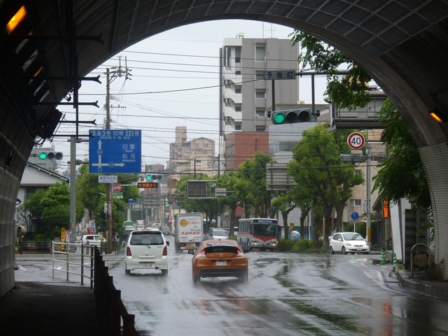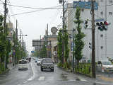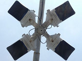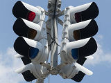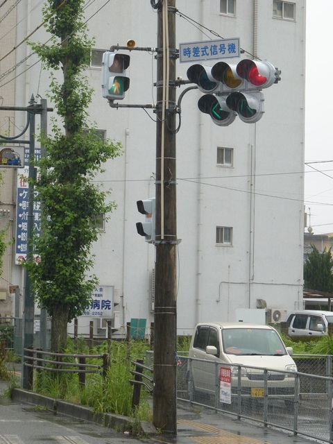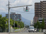 川沿いの交差点で、信号柱を設置できる場所が限られているため、4方向の車両用灯器が交差点中央に懸垂型で設置されています。