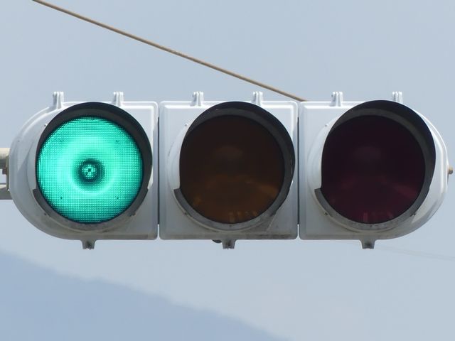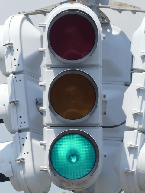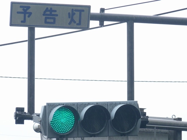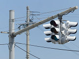 信号柱の位置の都合上、歩行者用灯器を車道にはみ出させて設置しなければならず、車両の接触防止のために、車両用灯器と同程度の高さに設置しています。
