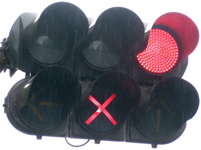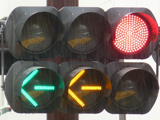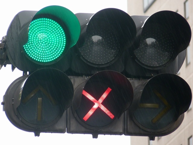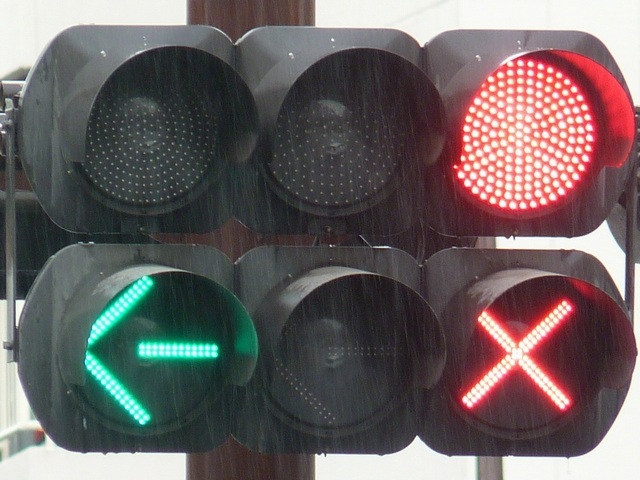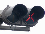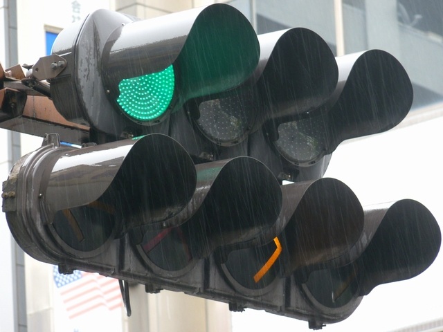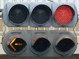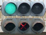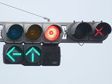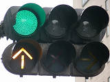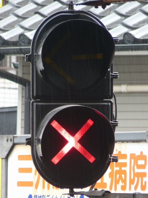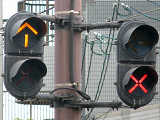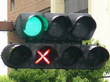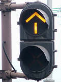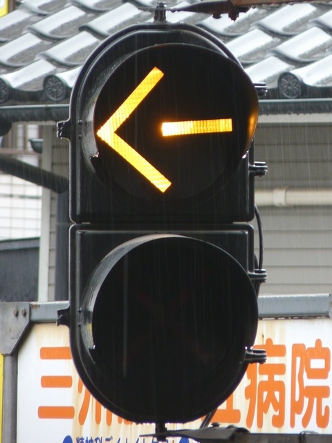 信号交差点に設置されています。電車が接近したときに、黄矢印が点灯します。