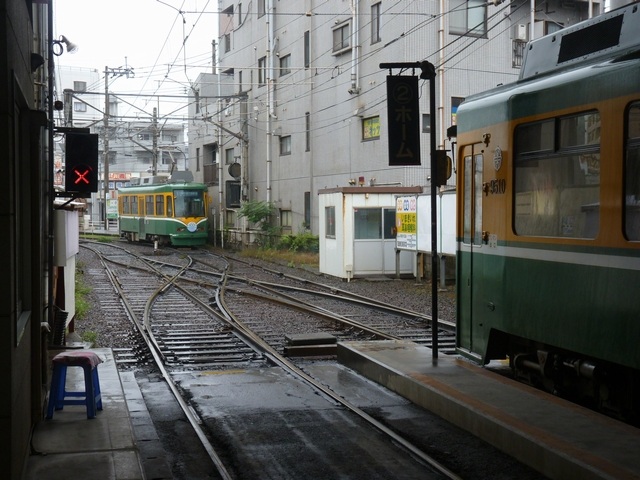 終始点の電停に設置されています。電車が入線する側では、入線する番線の方に向いた黄矢印が点灯します。電車が出発する側では、出発する方の番線に設置された灯器の黄矢印が点灯します。
