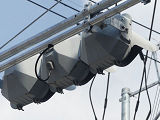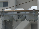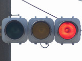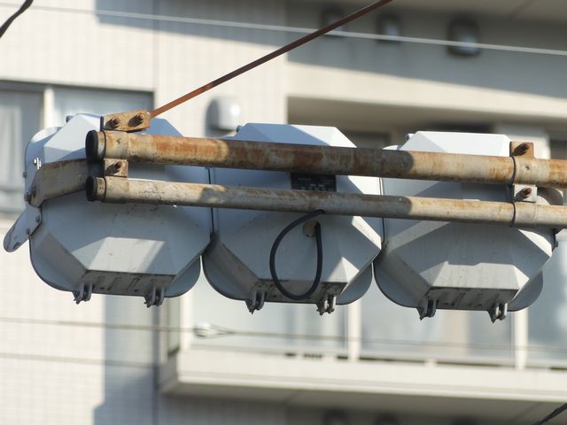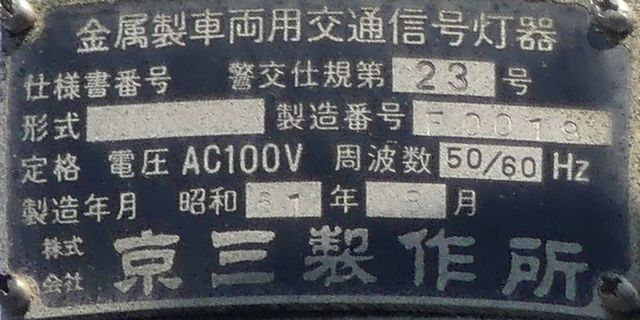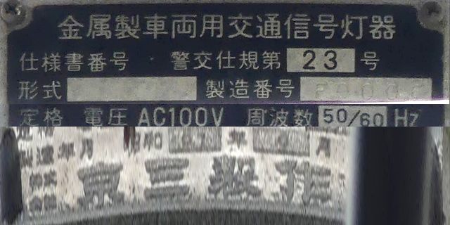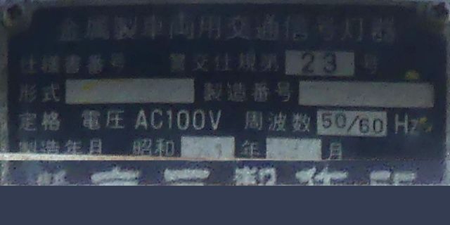 信号電材の量産試作型と思われる250φの車両用灯器です。ただしOEM製造のようで、銘板は京三製作所製となっています。他社製の分割型灯器で見られる耳パーツがありません。九州南部で少数設置されたようです。なお、福岡県大牟田市の信号電材の社屋内には同社で製造した歴代の信号灯器が展示されており、この灯器(コゲ茶色塗装)も展示されているようです。