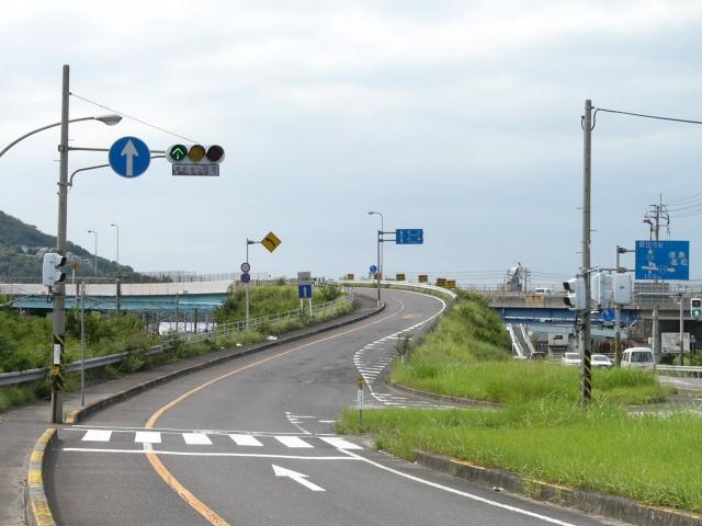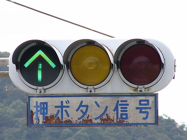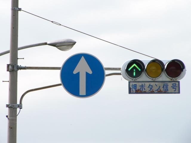 合流地点に設置された信号機で、本来の青灯の部分に直進矢印が組み込まれています。こちら側は「指定方向外進行禁止」規制で直進以外が禁止されています。なお、矢印点灯時に黄や赤が点灯しているわけではないので、信号では直進以外を禁止してません。