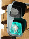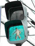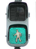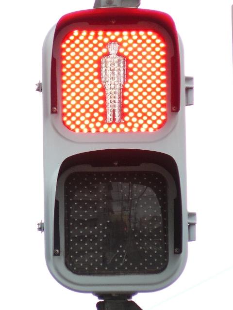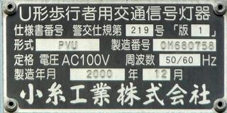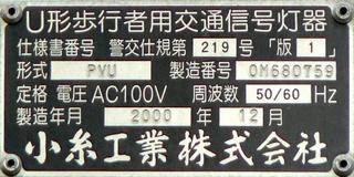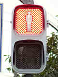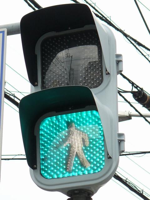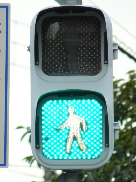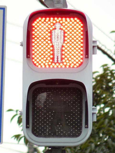 背景を青または赤、人形を白で灯火させるLED式歩行者用灯器です。試験的に製造されたものでしょう。