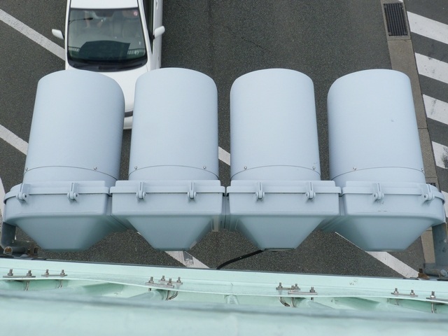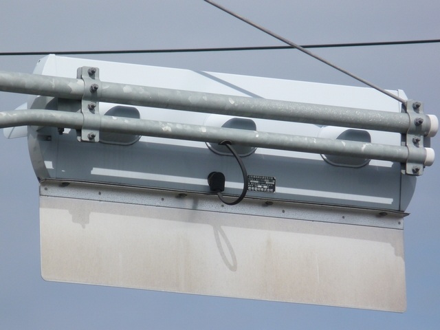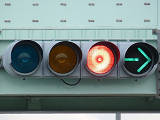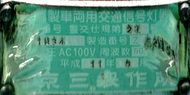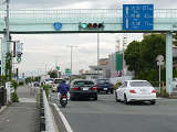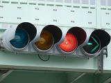 歩道橋に設置されており、矢印灯器を本灯器の下に設置すると高さ基準を満たさなくなってしまうためか、4位式灯器として矢印灯器を横に配置しています。