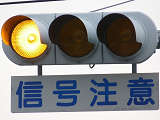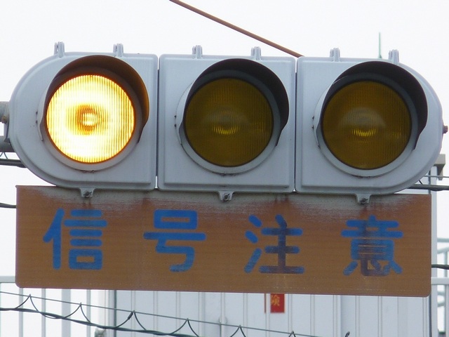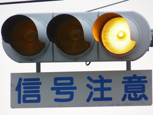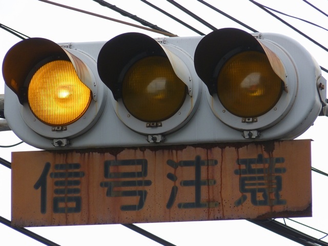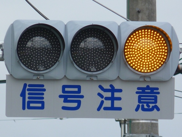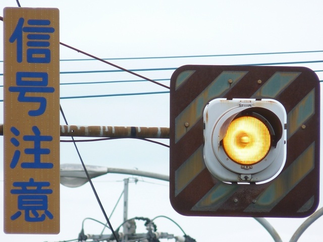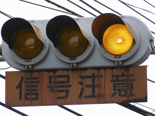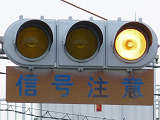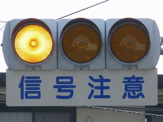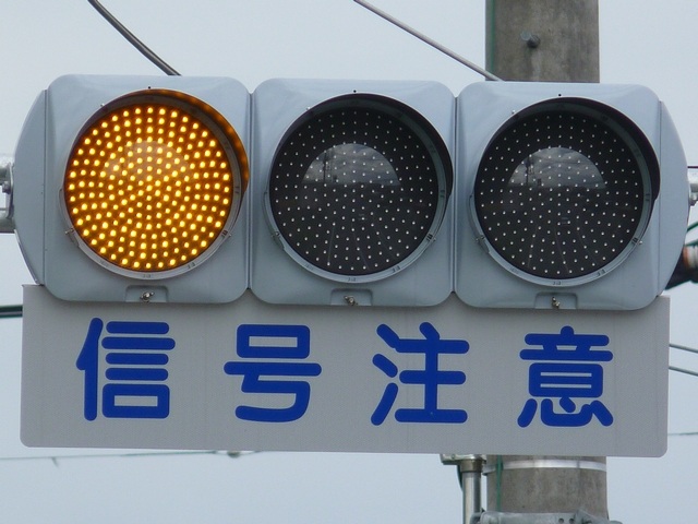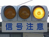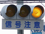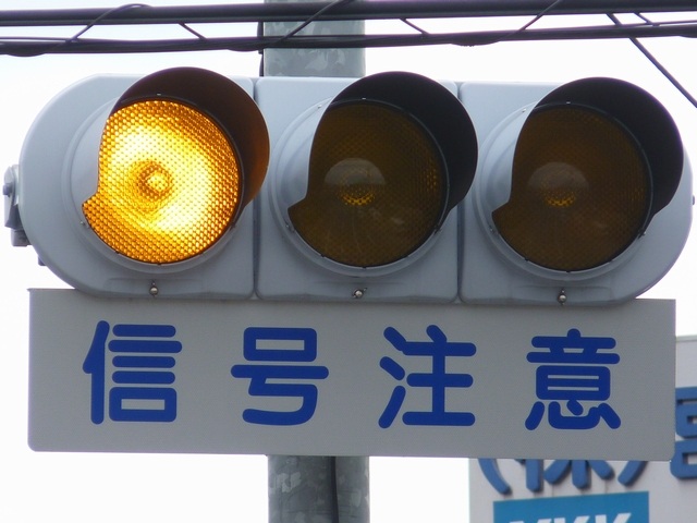熊本県では珍しい1位式の予告信号です。前方の信号に関わらず、常時黄が点滅しています。前方に信号交差点があるのを見通せない箇所に設置されます。