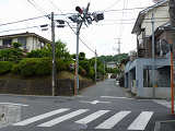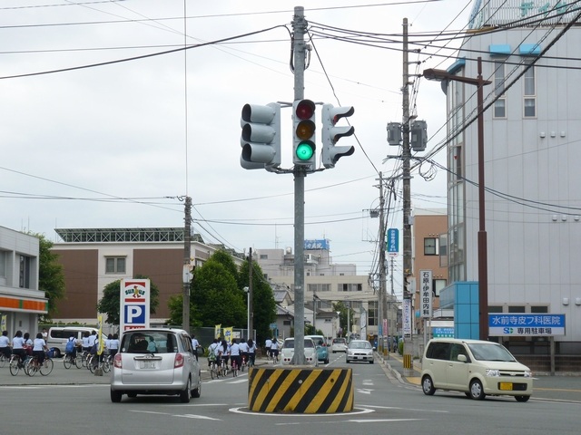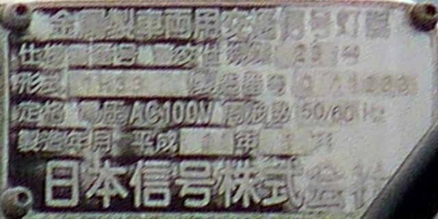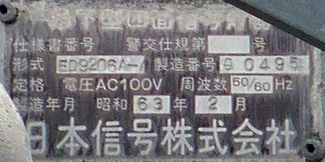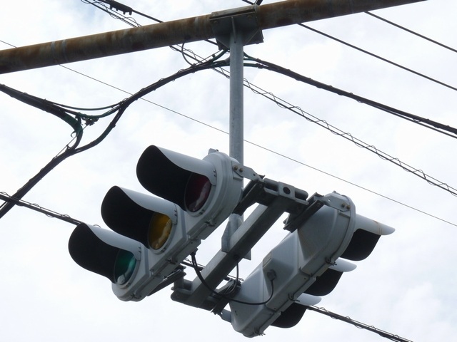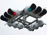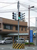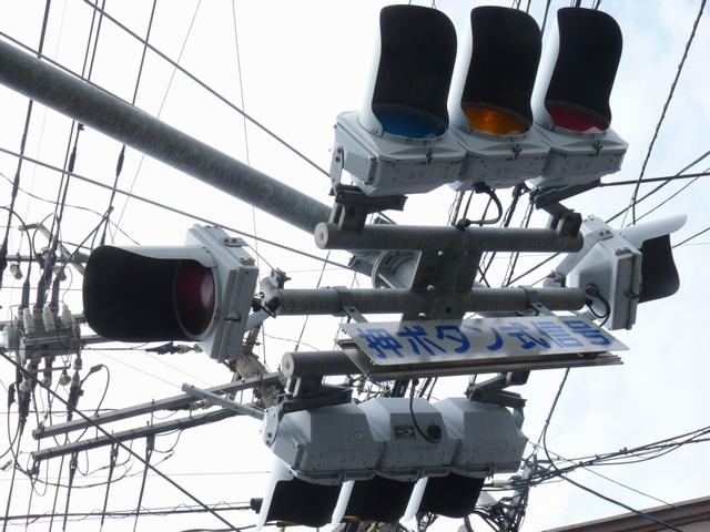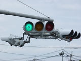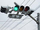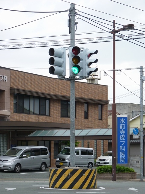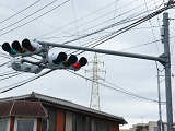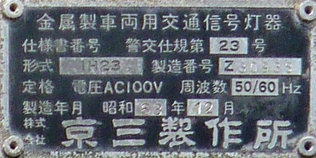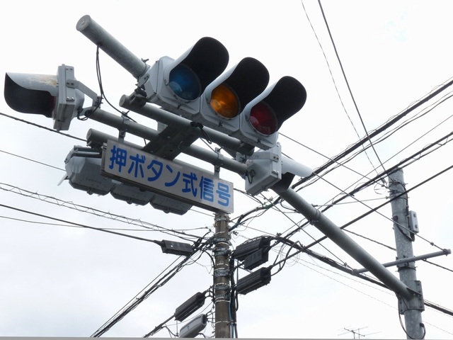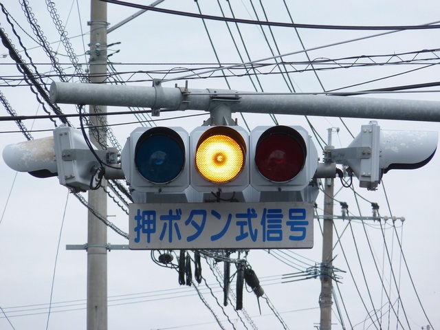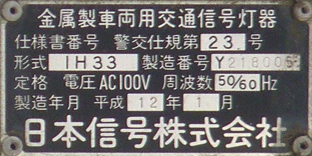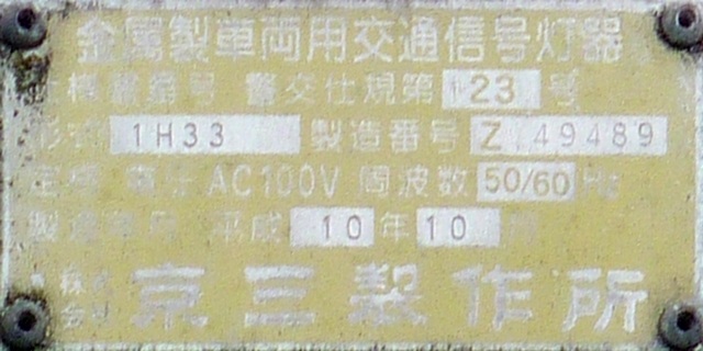 押ボタン式信号で、従道路側に1位式灯器が使用される状況であっても、狭い交差点では4方向の車両用灯器が交差点中央に懸垂設置されています。3色灯器と1位式灯器では、製造年月と名称が異なっています。