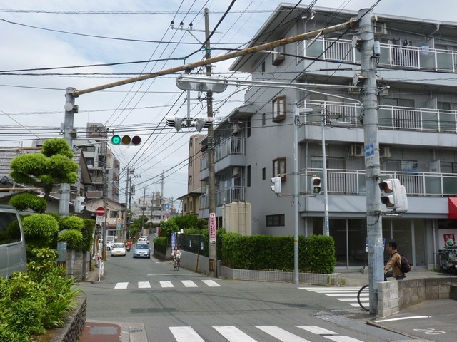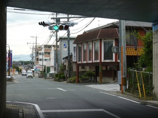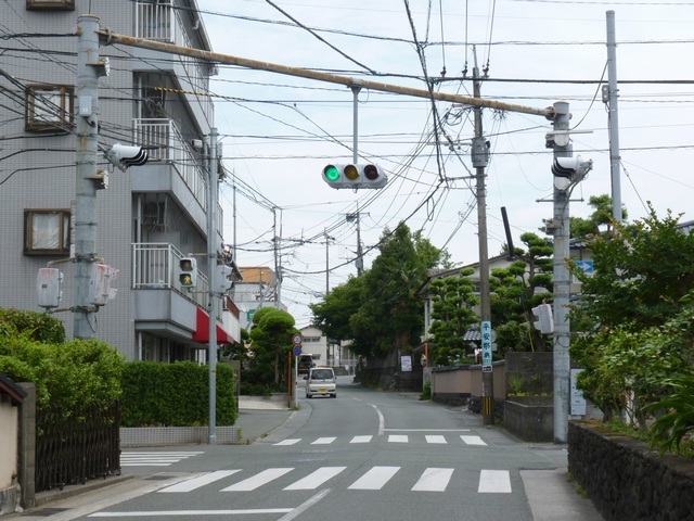 狭い交差点で、4方向の車両用灯器が交差点中央に懸垂設置されています。高架道路脇のため、高架奥となる方向については、灯器が低く設置されています。