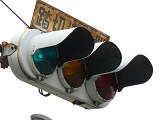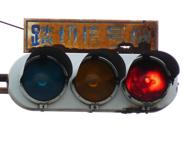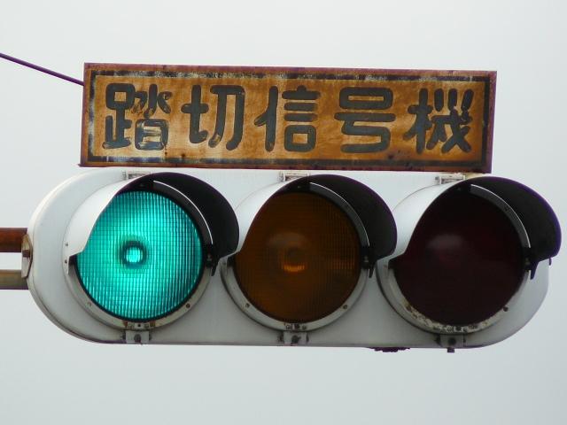 踏切信号機で、通常は青信号になっています。おまけの赤は非常時用か予備用だと思われます。