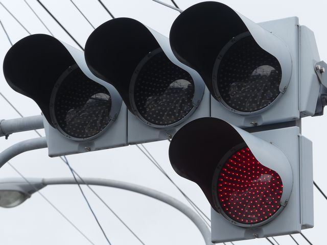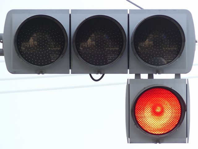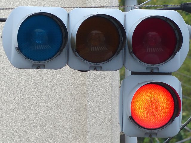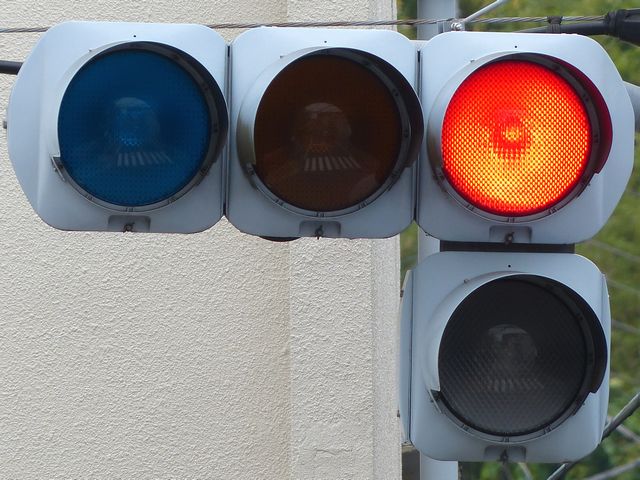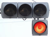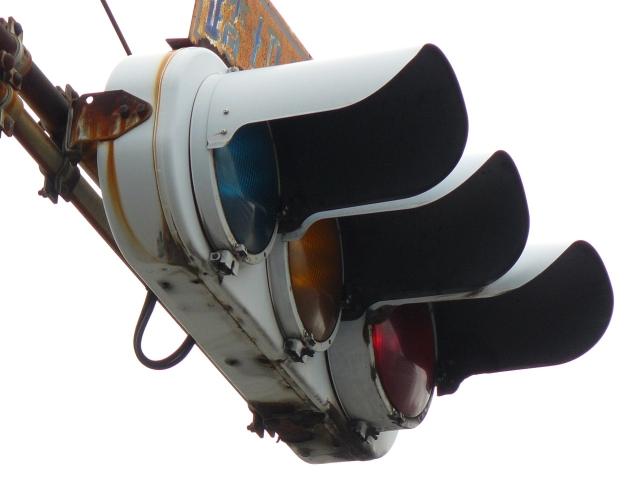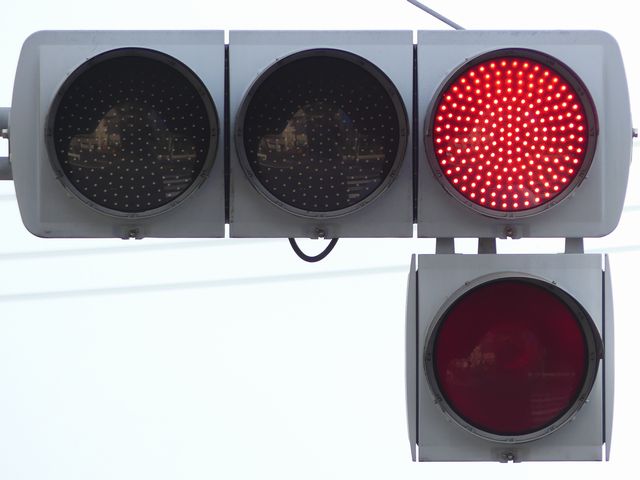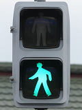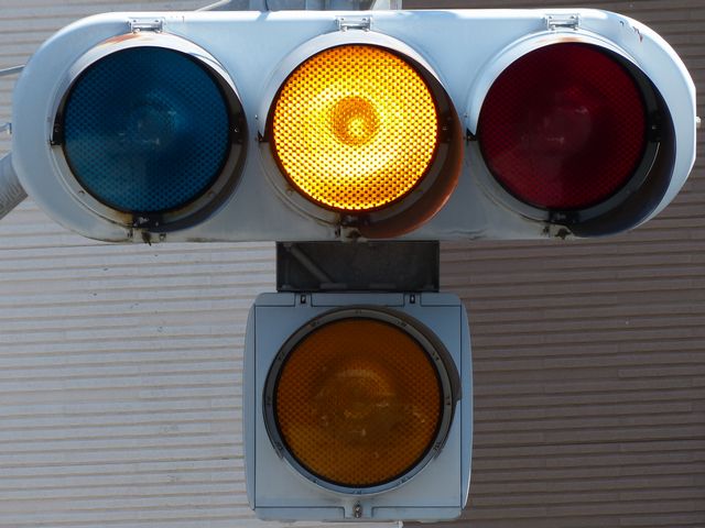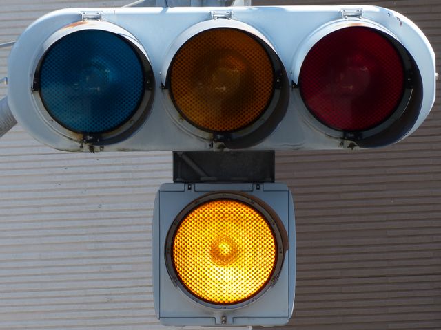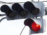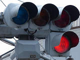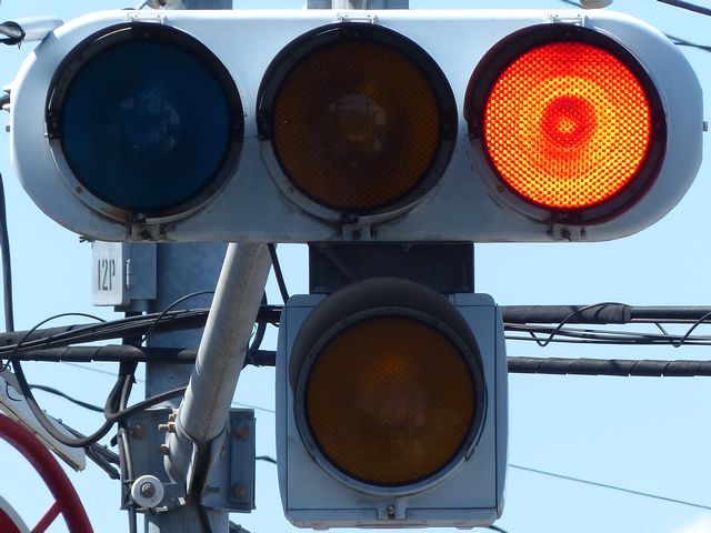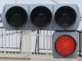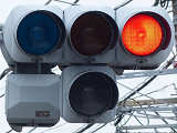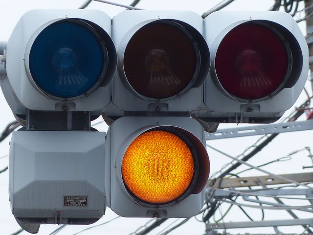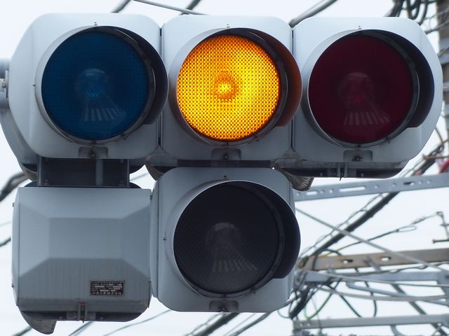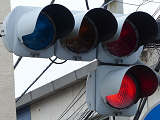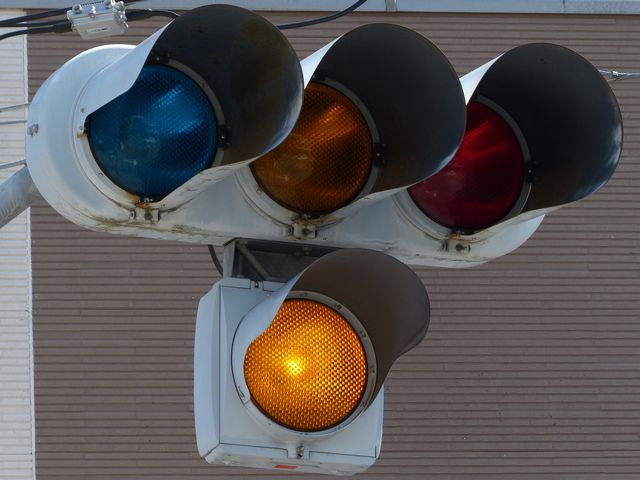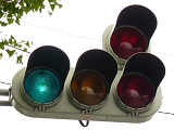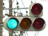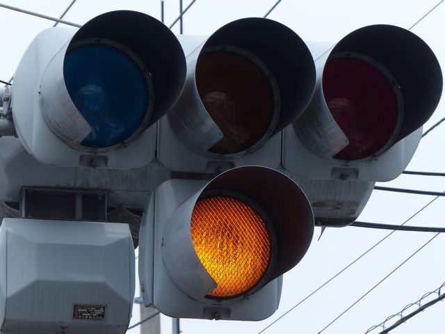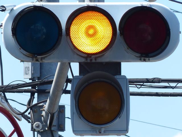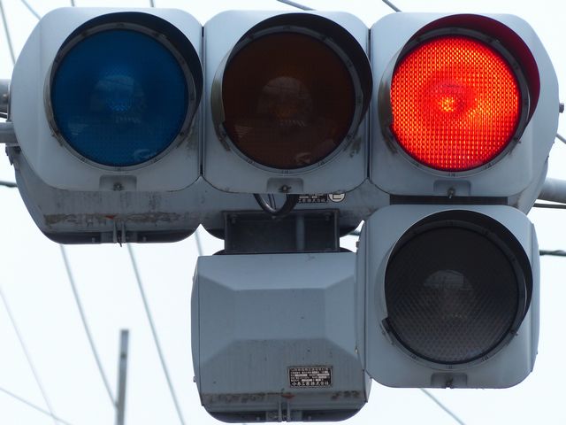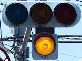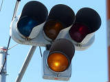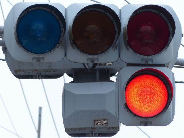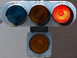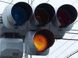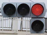 変則交差点の交通量の少ない道路で使用されます。他の道路に対して青信号を表示している時に点滅して同時に交差点内に進入させます。赤点灯は3色灯器を、赤点滅は3色灯器の下の1位式灯器を使用します。