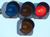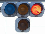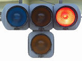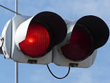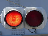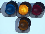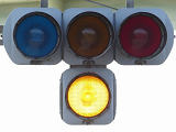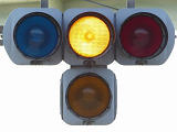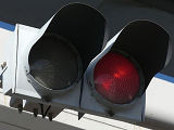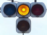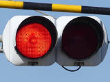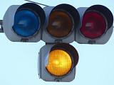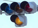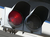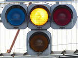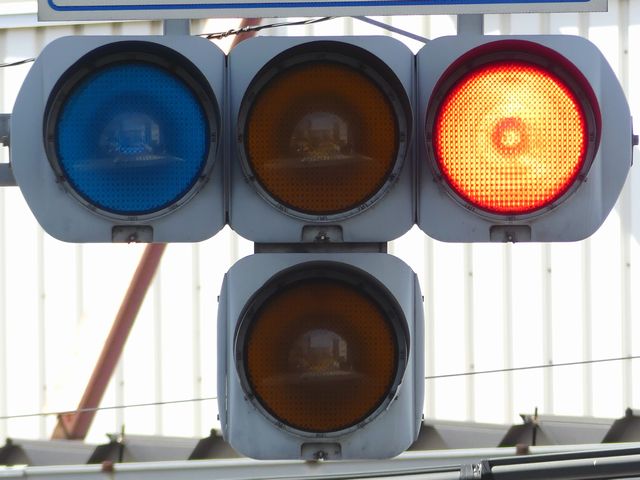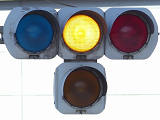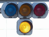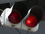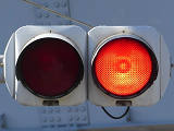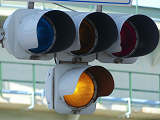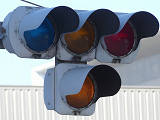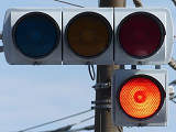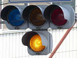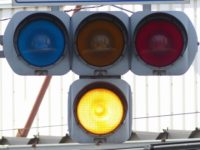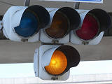 踏切に隣接する交差点の踏切直交側で、踏切から交差点に向かう側は青信号にならず、黄点滅で注意しながら進行させます。黄点滅は3色灯器の下の1位式灯器を使用し、黄点灯、赤は3色灯器を使用します。