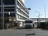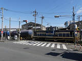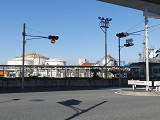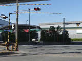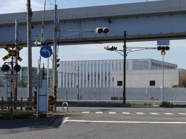 踏切に隣接するT形交差点(一方は工場出口)の踏切直交側で、工場出口側は青信号にならず、黄点滅で注意しながら進行させます。黄点滅は3色灯器の下の1位式灯器を使用し、黄点灯、赤は3色灯器を使用します。
