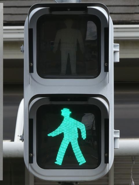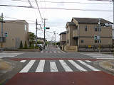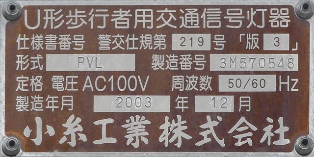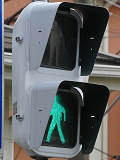 住宅街の十字路にある押ボタン式信号で主道路横断用の歩行者用灯器4基に大型のフードが取り付けられています。フード側面の穴の形状から距離制限のルーバーを取り付けるもののように見えます。