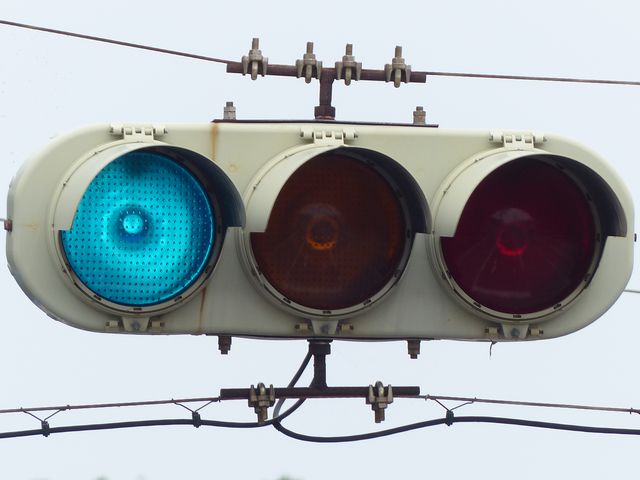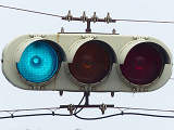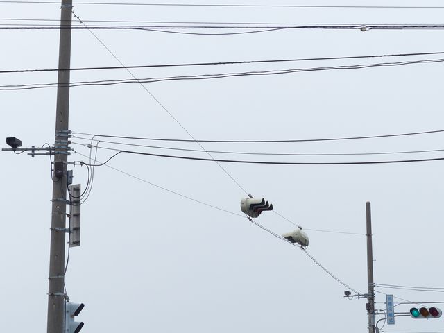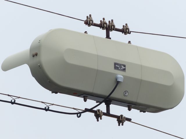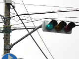 川沿いで道路のすぐ脇に信号柱を設置できないため、離れた位置にある信号柱に2本のワイヤーを張ってその間に灯器を設置しています。