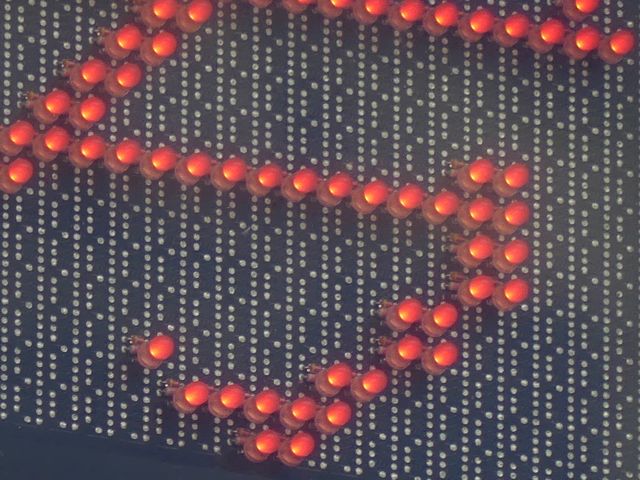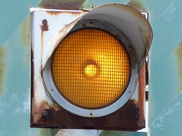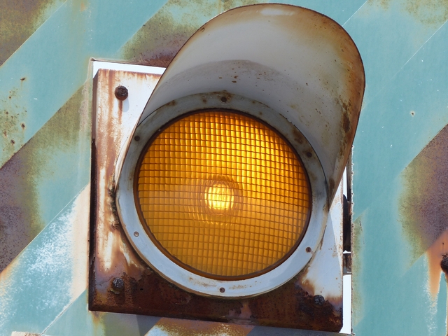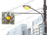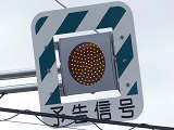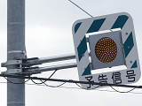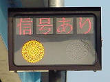 京都府の基本的な予告信号です。前方の交差点の歩行者用信号が青点滅を開始してから車両用信号が黄・赤になっている間に点滅し、それ以外の時は消灯しています。