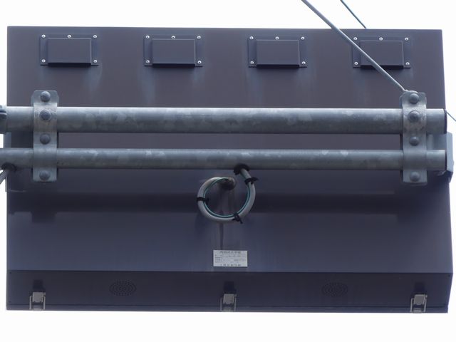 大阪府などで設置されている「内照式文字板」を使用したタイプの予告信号です。制御機が内蔵されています。常時、左右の黄が交互に点滅しています。