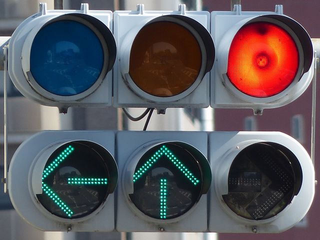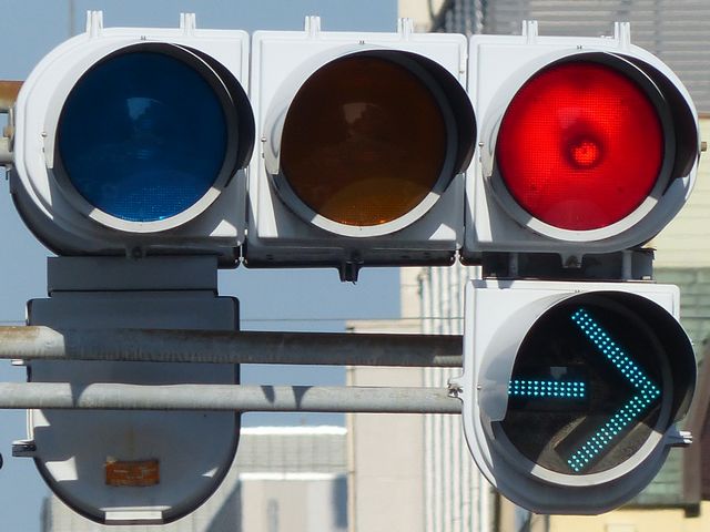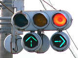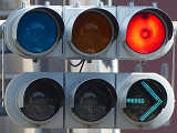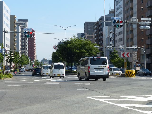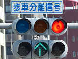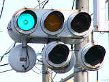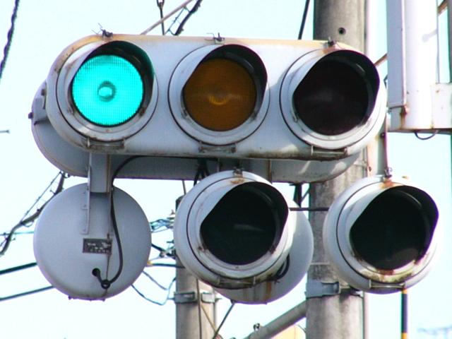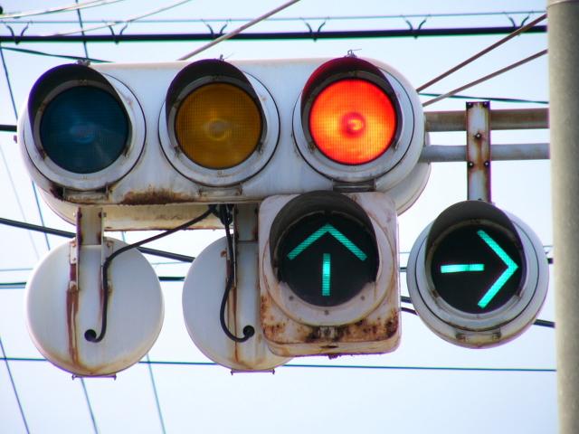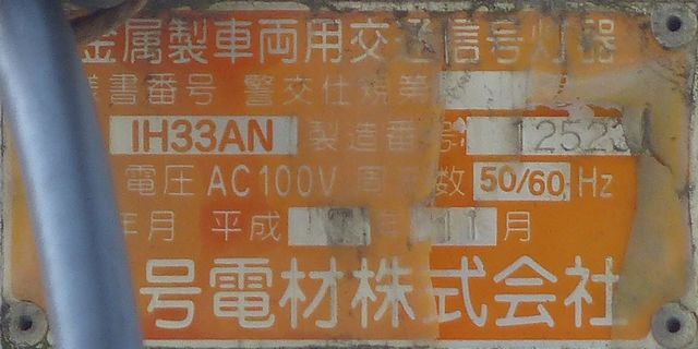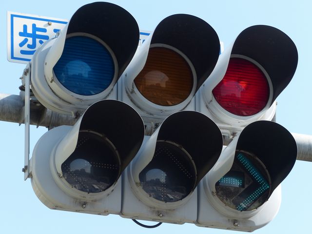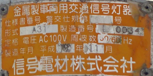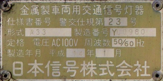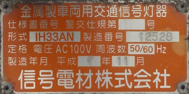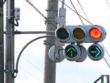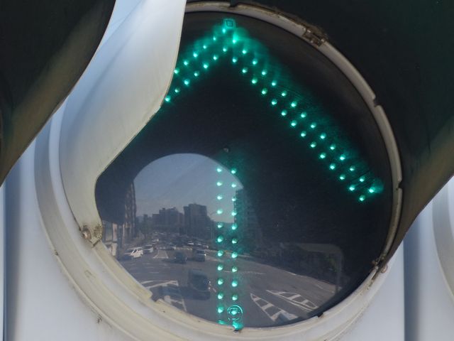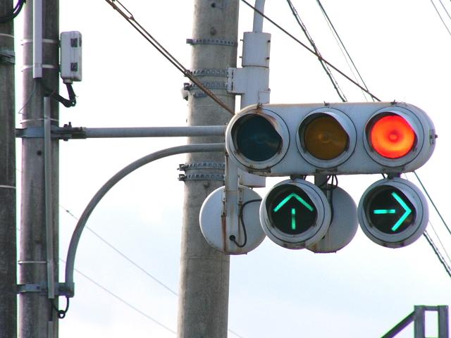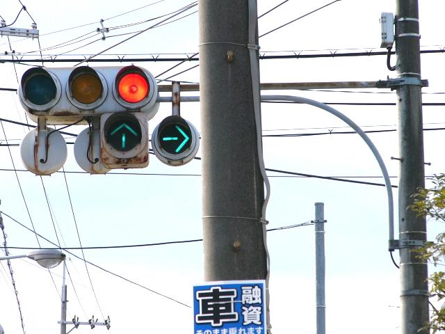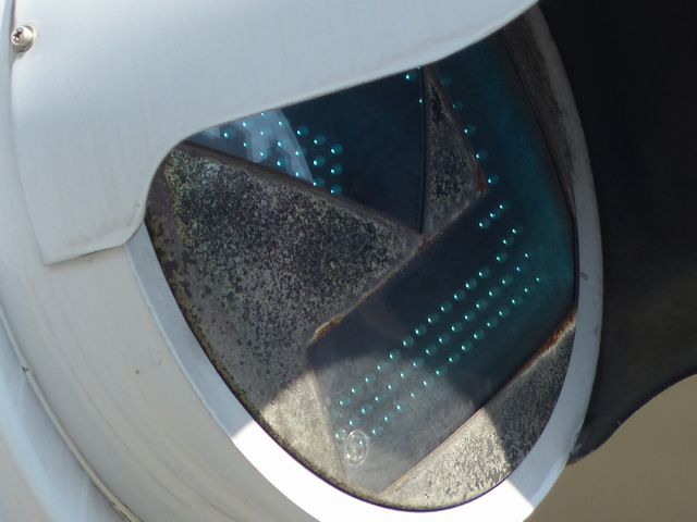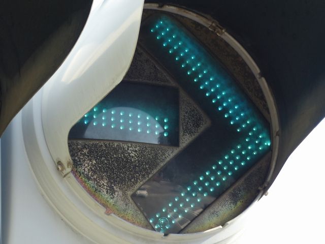 左折矢印と直進矢印はLED2列配列ですが、右折矢印はLED3列配列です。右折矢印灯器にはレンズの反射を防ぐためか矢印以外の部分がマスクされています。従道路側の右折矢印と同様なので、主道路側が歩車分離信号化された時に、既設の右折矢印灯器のLEDレンズ部分を新しい一体型3位式矢印灯器にそのまま組み込んだようです。