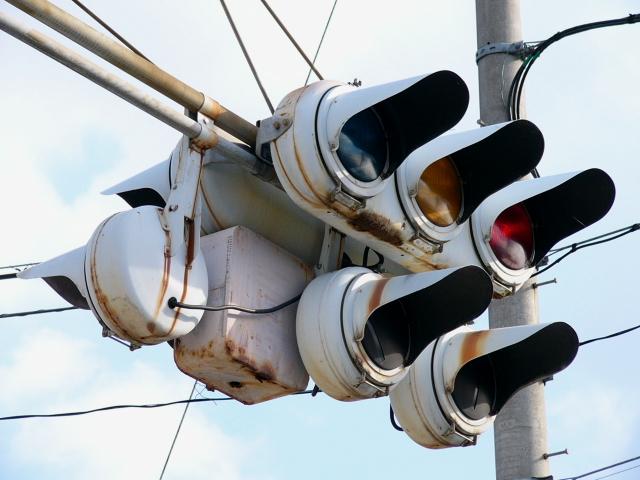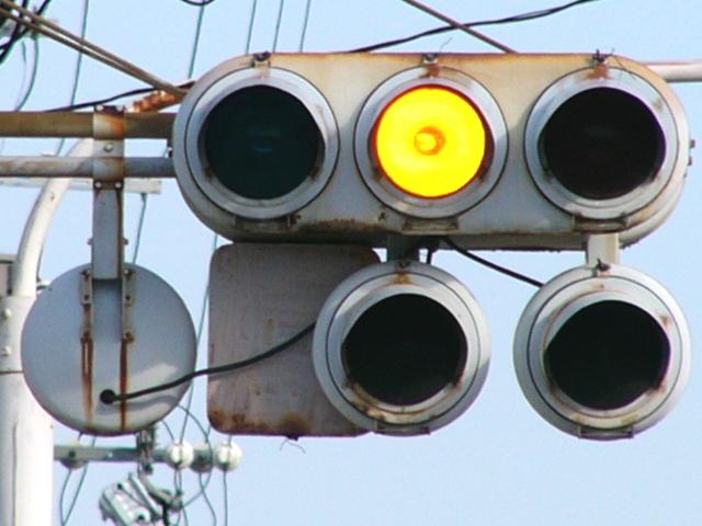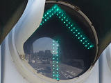 通常、矢印灯器は直径300mmレンズを使うことが多いのですが、ここでは直径250mmレンズ灯器を使用しています。なお京三製作所製のこの世代の矢印灯器はアームから吊り下げる設置方法なので前後同じ位置に設置することができず、ずらして設置しています。