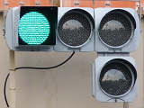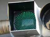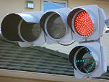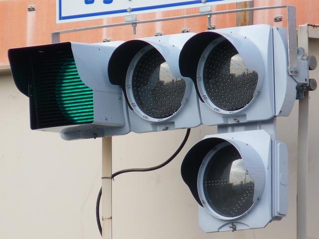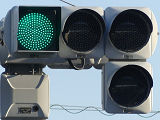 ショートフードの薄型灯器ですが、鋭角交差点での誤認防止のため、青のみ片かくしフードとなっています。