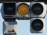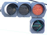 連続交差点での誤認防止のため、青のみ距離制限フードとなっています。