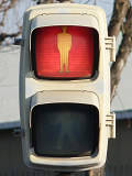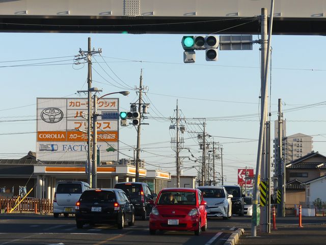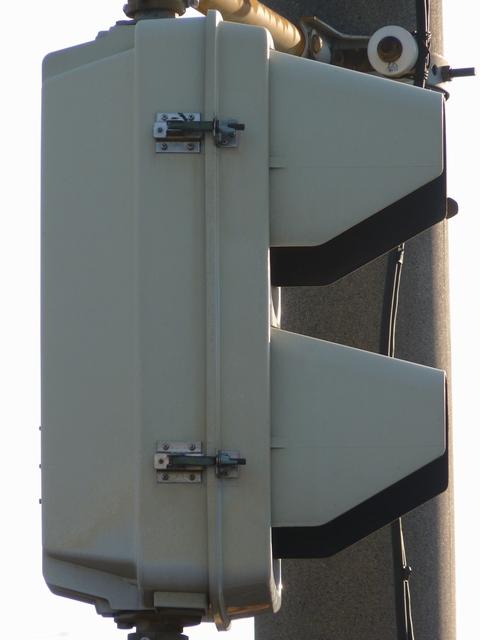 愛知県で採用されていた下向きフード(愛知フード)の樹脂製灯器が、この交差点に1基だけ設置されています。正面から見ると灯火面が少し隠れてしまいます。