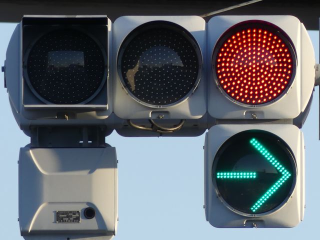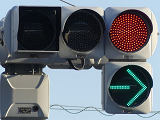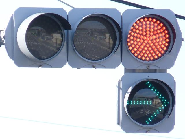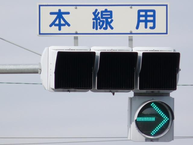 側道が交差しているため、誤認防止のために左右制限フードとなっています。矢印灯器には制限フードは装着されていません。