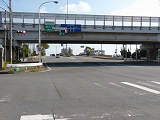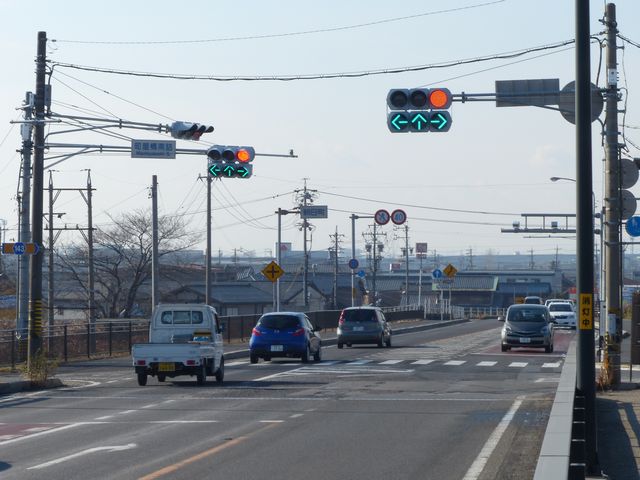 2007年5月に霞大橋西詰の交差点で日本で初めて導入されたムーブメント信号制御です。ムーブメント信号制御となっているのは、東西方向(側道を除く)のみです。東西方向(側道を除く)の車両用灯器のみに「時差式」の標示板が設置されています。