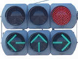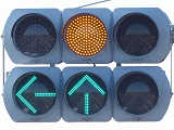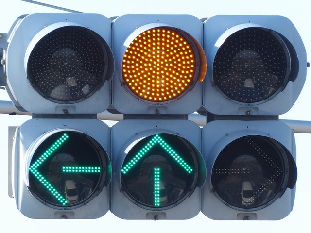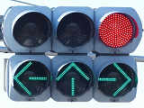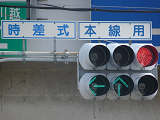 矢印信号を表示することで通行権を延長させる方式の「時差式信号機」です。本信号は対向側と同じになっており、黄信号になったときに直進、左折矢印が点灯し、赤信号になると右折矢印も点灯します。なお、左折先は狭い非舗装路となっており、対向側からの右折は禁止されていません。