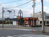 牛丼屋の駐車場とドライブスルーの入口に向けて灯器が設置されており、撮影時、信号は常に赤でした。以前、この位置には、運送会社の出入口があり、そちらに対して設置されていたものが、撤去されずに残っていたようです。