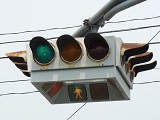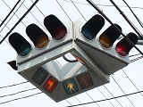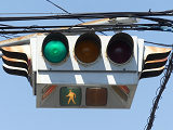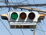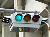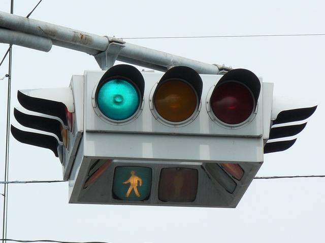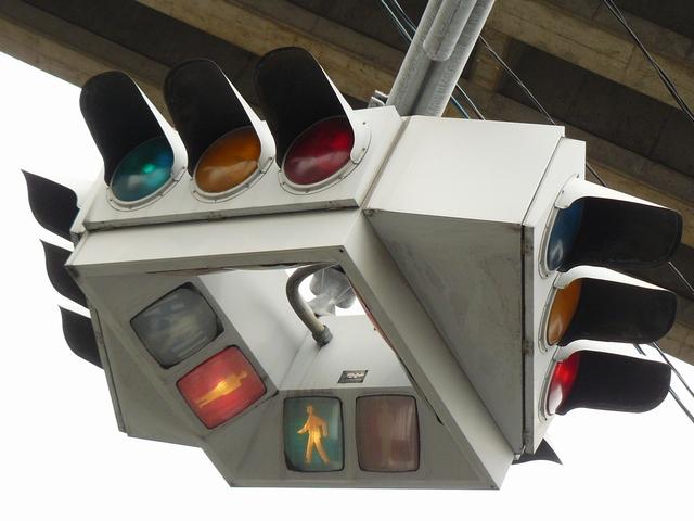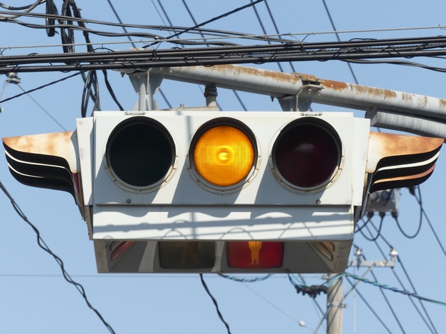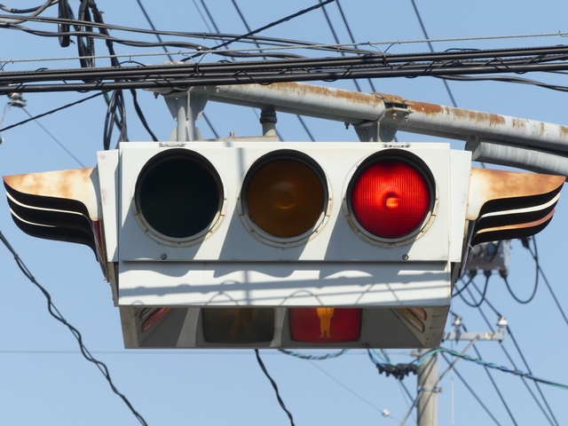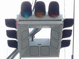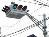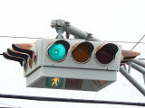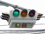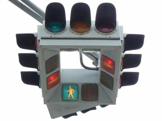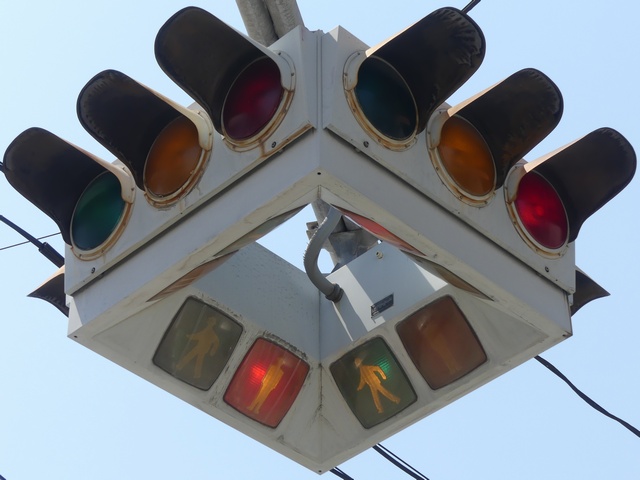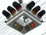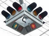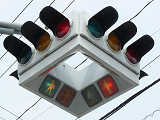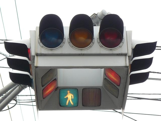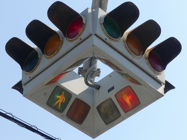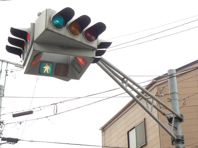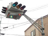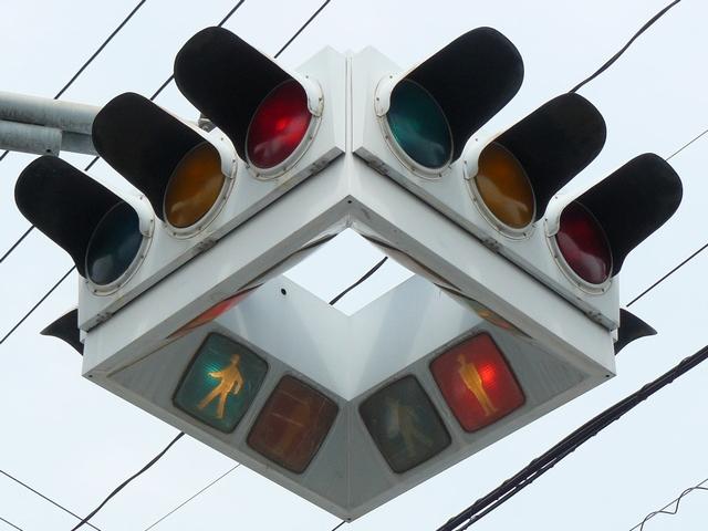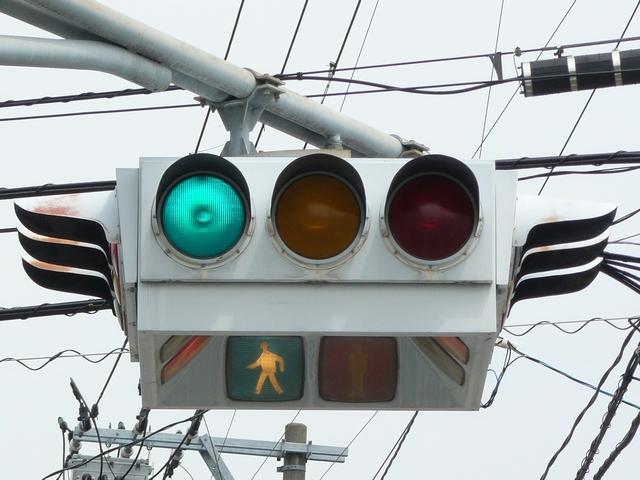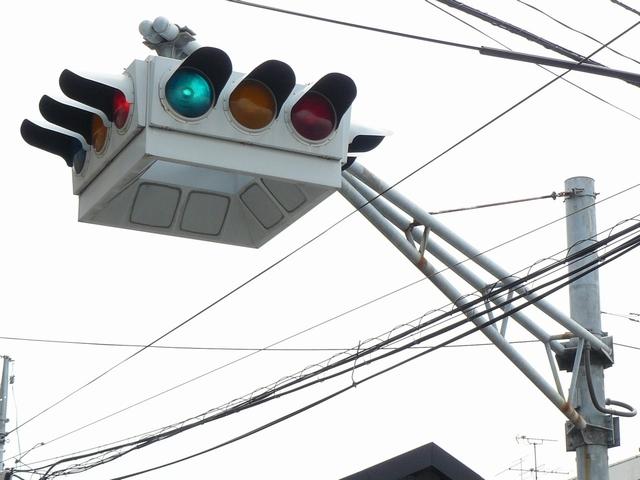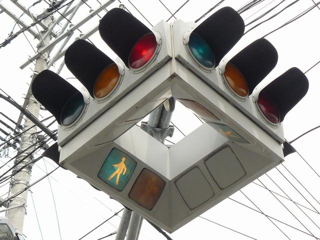 4方向の車両用灯器と歩行者用灯器を1つにまとめて交差点の中央に吊り下げている「懸垂型交通信号灯器」です。交差点の中央に浮かんで灯器の周囲や下を照らしているように見えるため、メディアで紹介されるときなどは「UFO型信号機」と呼ばれています。愛知県に2台、宮城県に数十台設置されていたことが確認されていますが、老朽化により順次、通常の信号機への交換や標識化により、2024年度当初で公道に設置されているものは仙台市内の3か所(青葉区角五郎、若林区木ノ下、太白区長町)のみとなっていました。その3か所も2024年7月に通常の信号機に交換され、行動に設置されていたものはすべて撤去されました。(宮城県内の運転免許センターや交通公園にはまだ数台設置されています。)