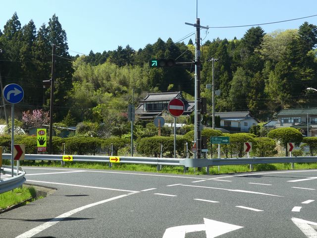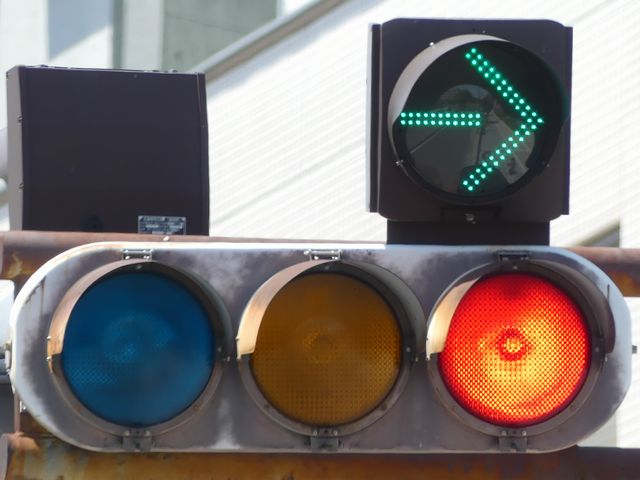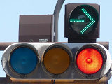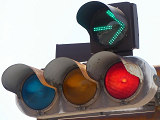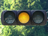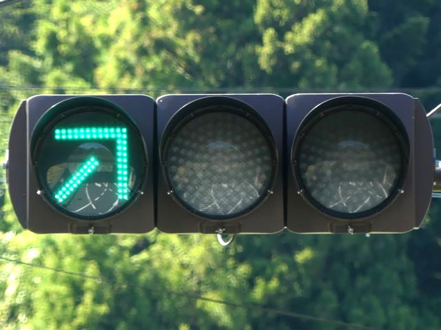 高速道路のIC内で入口ランプと出口ランプが交差する箇所が信号交差点となっており、入口側車両が誤って出口側に左折しないよう右折矢印信号で誘導しています。青信号にならないため、本来の青灯火の部分に矢印灯火を組み込んでいます。矢印点灯時に赤灯は点灯しません。
