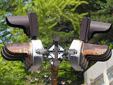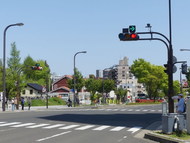 デザイン柱でアームの高さが決まっており、矢印灯器を本灯器の下に設置すると高さ基準を満たさないためか、本灯器の上に設置しています。
