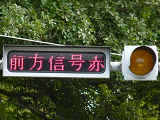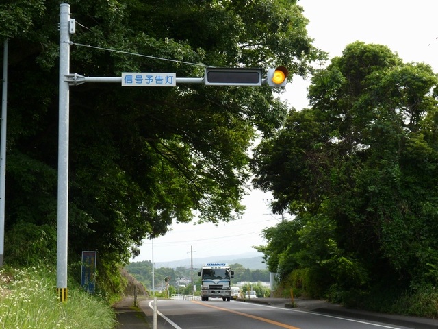 この先カーブ後の下り坂に信号交差点があるため、その「信号予告灯」として設置されています。前方の信号が青の時は、黄点滅しLED式標示板は何も表示されません。前方の信号が黄か赤の時は、灯器の灯火は消灯しLED式標示板の「前方信号赤」の表示が点滅します。(この灯器の位置から前方の信号が見通せないため、詳細な連動状況は確認できません。)