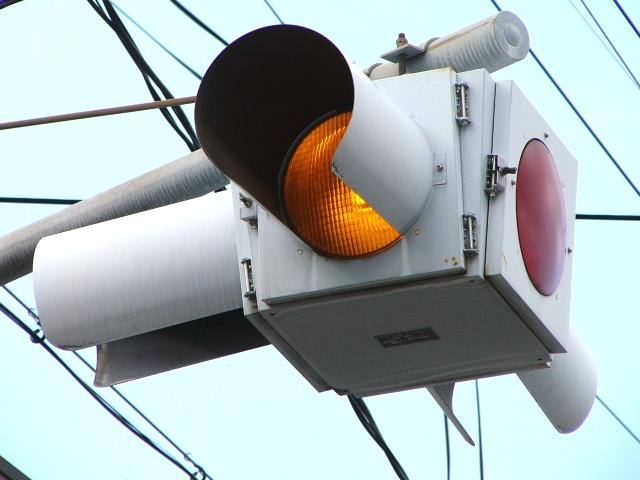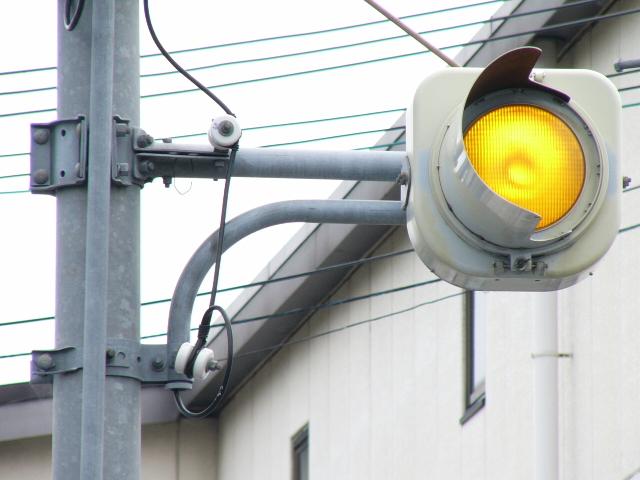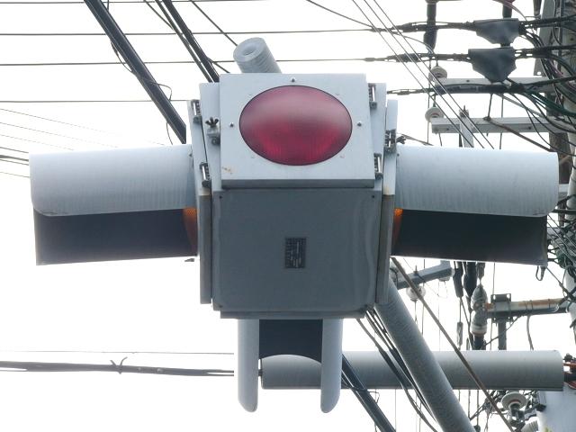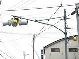 交差点の手前がゆるいカーブになっており、手前からでは懸垂式4方向1灯点滅灯器が見えないため、補助灯器が設置されています。