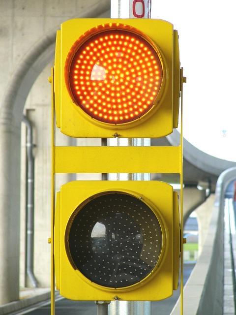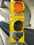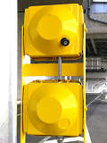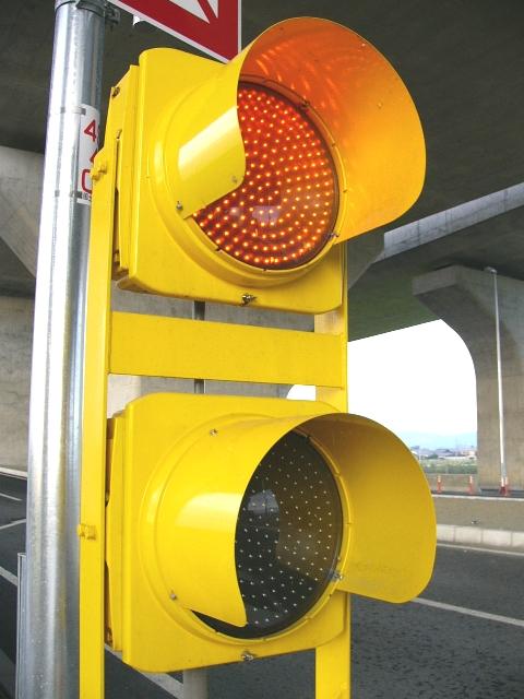T形交差点の4方向一体型1灯点滅灯器です。全方向レンズが設置されていますが、道路の無い方は点灯せず、フードも設置されていません。