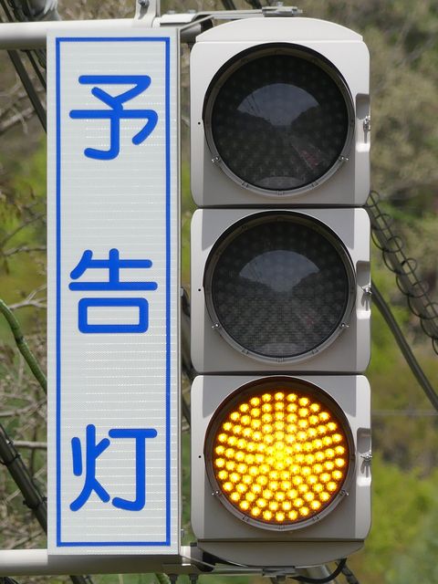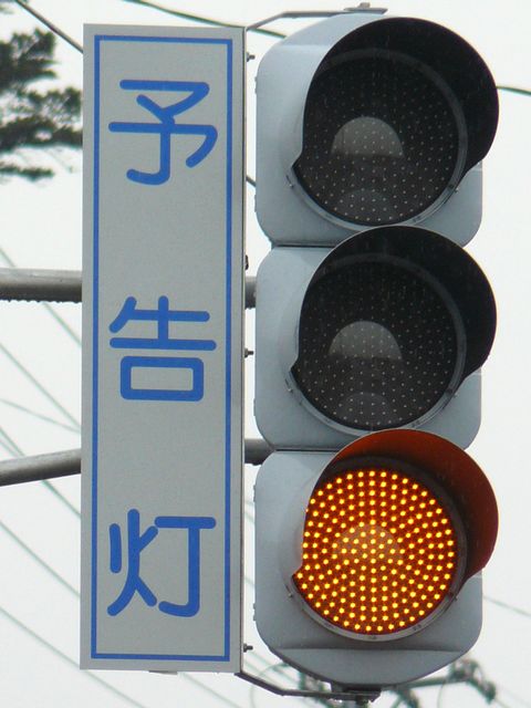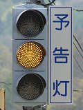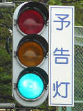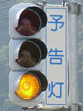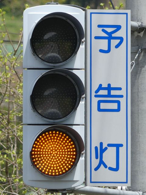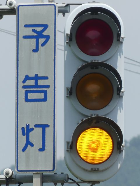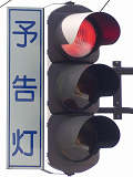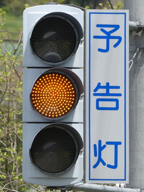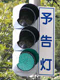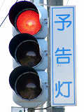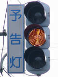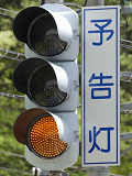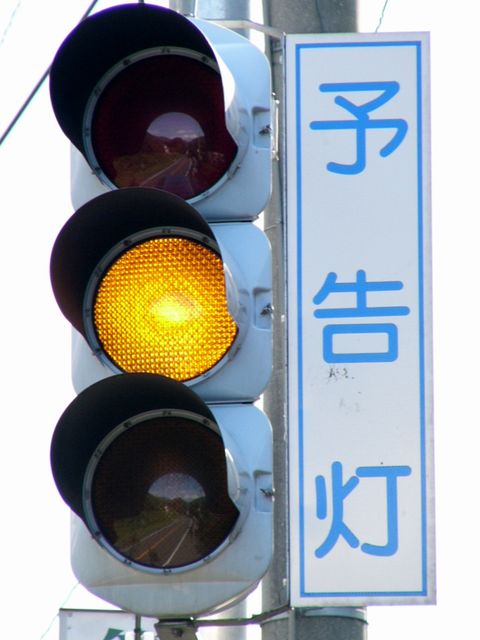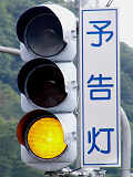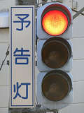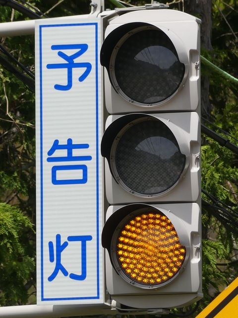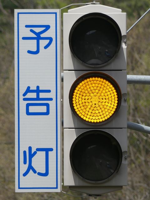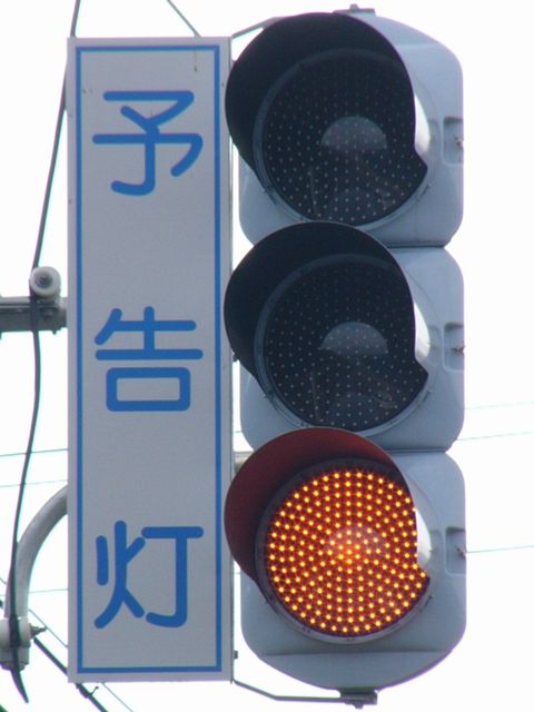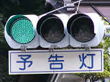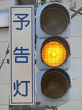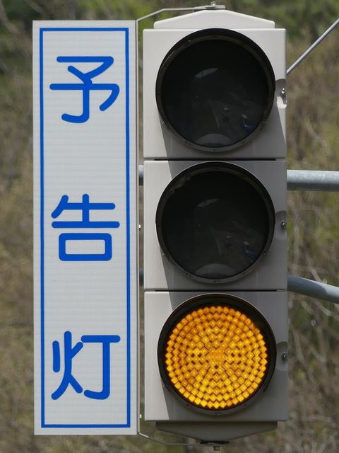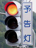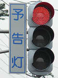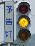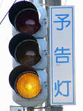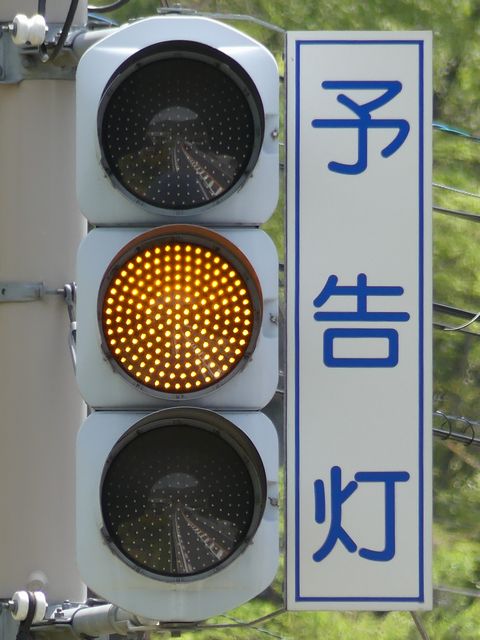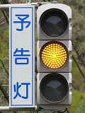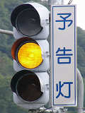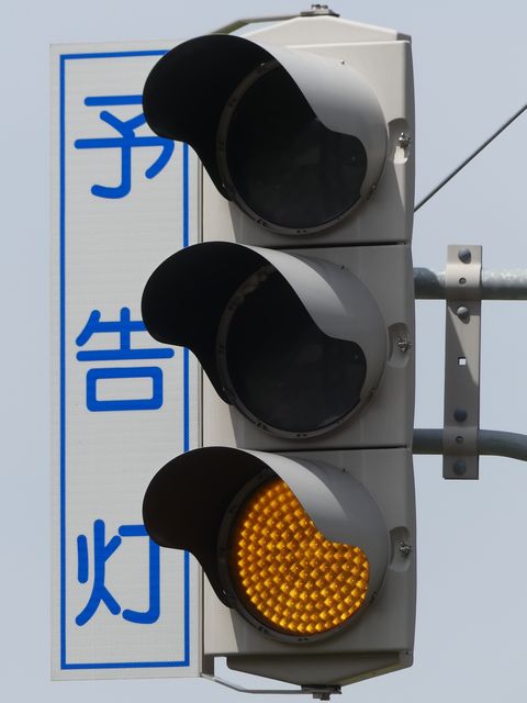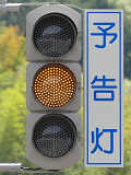 信号が少なく交通量の多い道路や交差点手前にカーブや起伏があり見通しが悪い場合に設置される「予告灯」です。前者の場合、他県に比べてかなり交差点から離れた位置に設置される場合があります。300m近く離れた位置に設置されているものもあります。