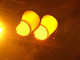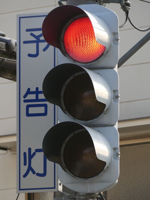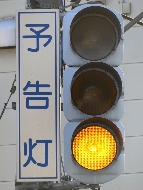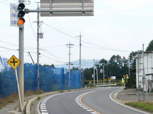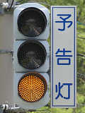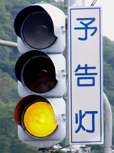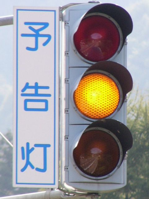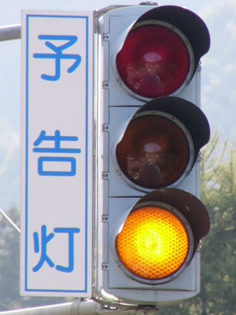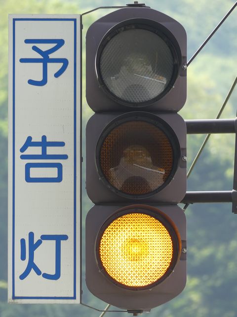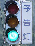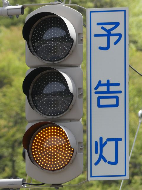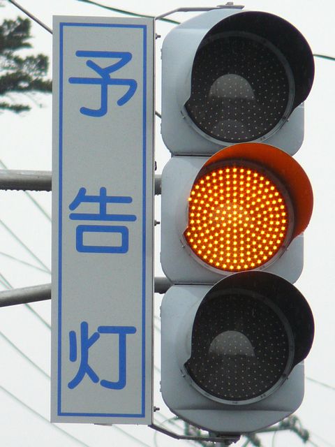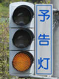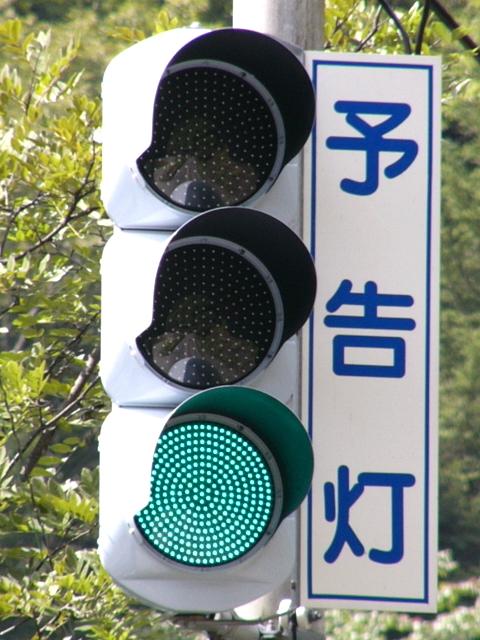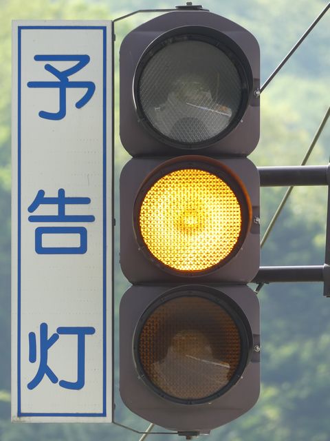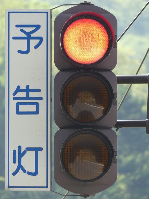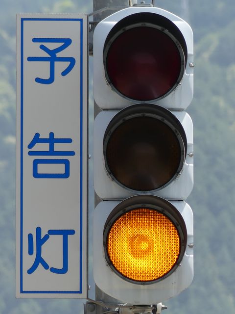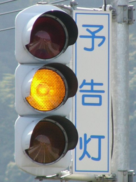 信号が少なく交通量の多い道路や交差点手前にカーブや起伏があり見通しが悪い場合に設置される「予告灯」です。前者の場合、他県に比べてかなり交差点から離れた位置に設置される場合があります。300m近く離れた位置に設置されているものもあります。