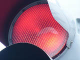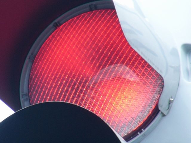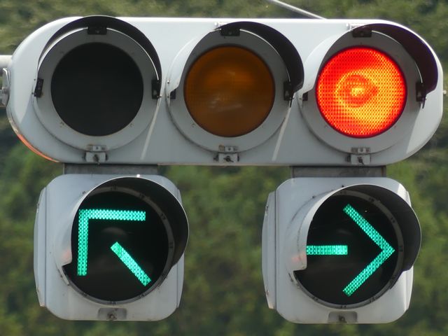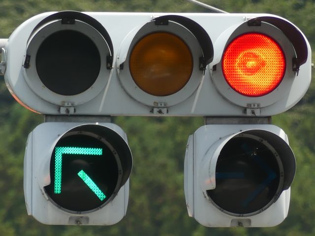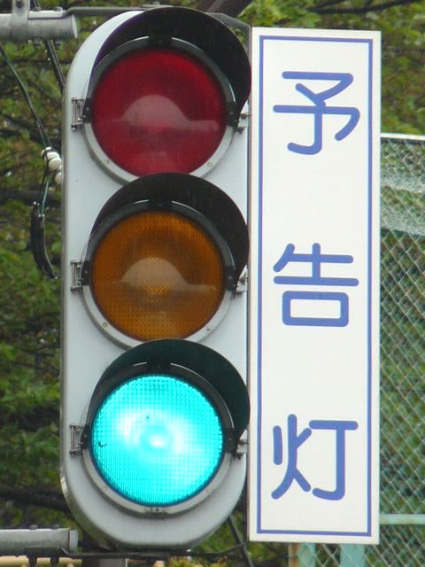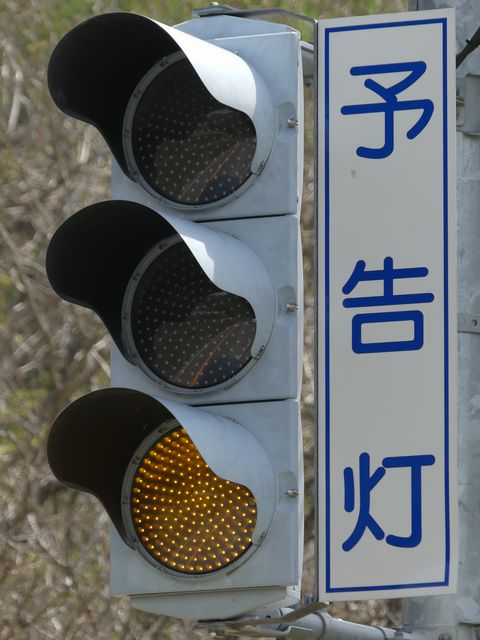 こちらは前方が直進しかできない信号であっても「予告灯」が黄点滅します。なお、前方の信号は青信号にならないため、使用しない青灯火の部分に黒い蓋が装着されています。