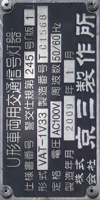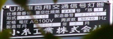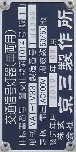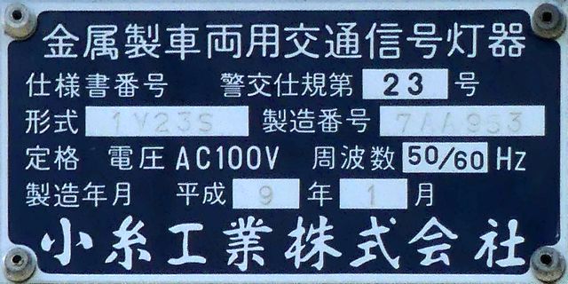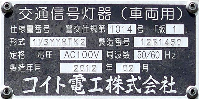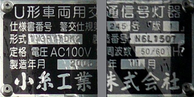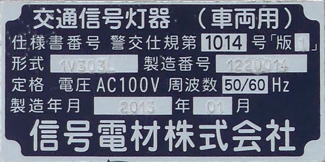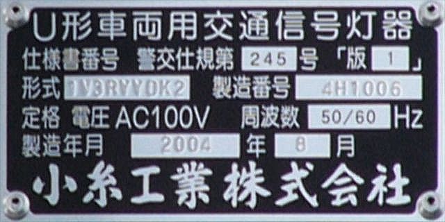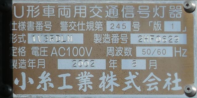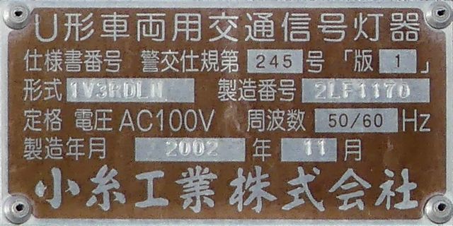 銘板に打刻された形式が「1V3RYYDK2」となっており、「RYY」の部分が赤・黄・黄を表していますが、通常の(上から)赤・黄・青の灯器では「GYR」となっているので、通常とは逆となります。