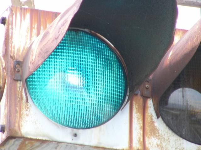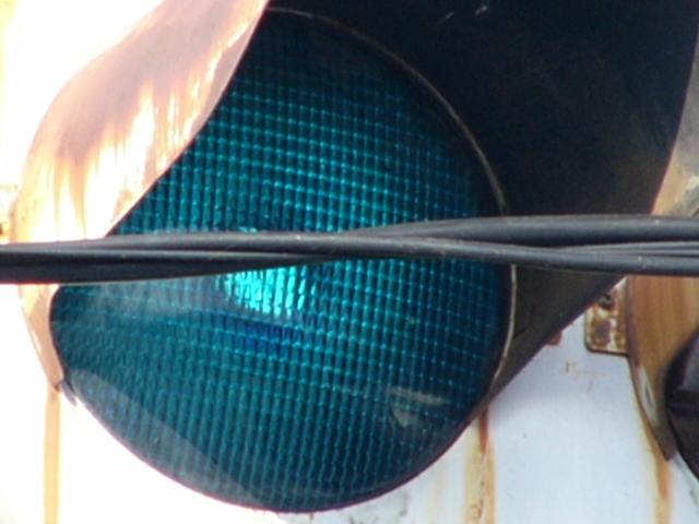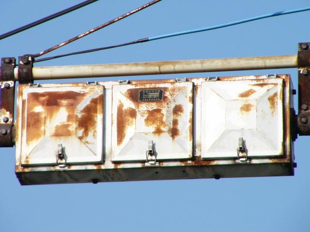 小糸工業製の直径250mmレンズ灯器です。名称は「交通信号灯器」となっており、銘板は背面上部に付いています。蝶番が上にあります。