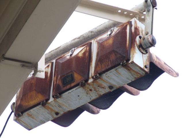 小糸工業製の直径250mmレンズ灯器です。名称は「交通信号灯器」となっており、銘板は背面下部に付いています。蝶番が下にあります。