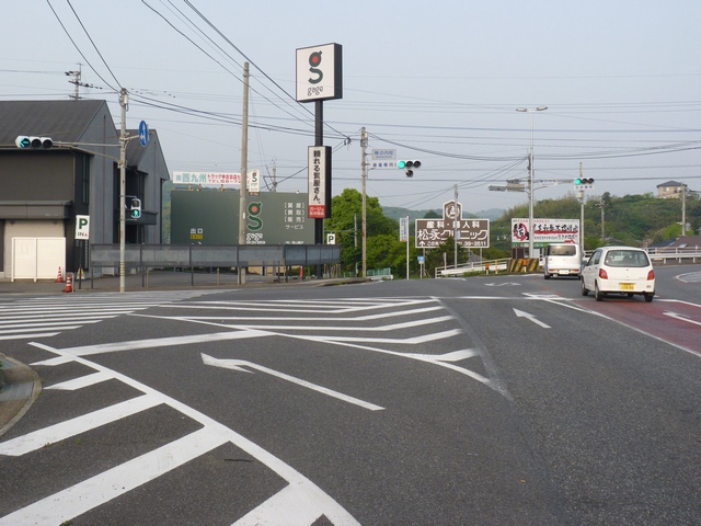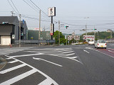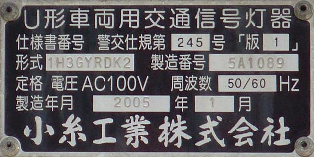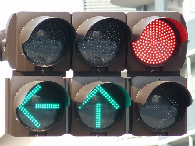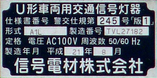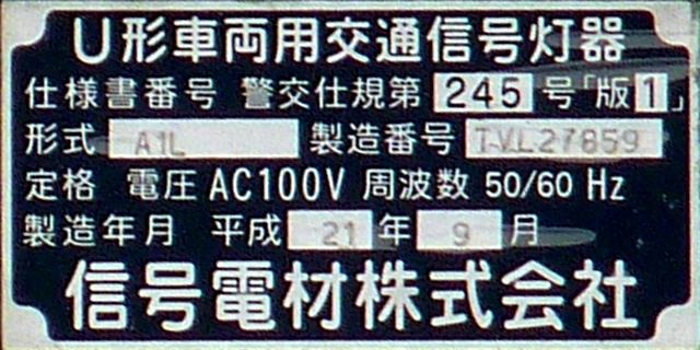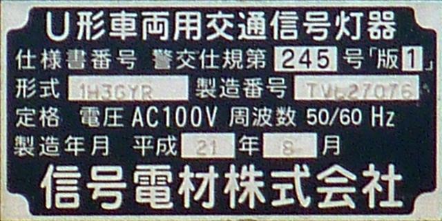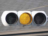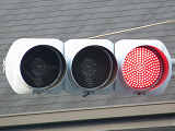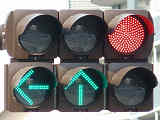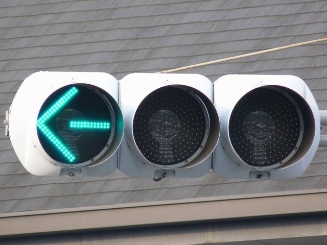 本来の青灯の部分に左折矢印が組み込まれています。この灯器の信号サイクルは「←・・・黄・・・赤」で、左折矢印点灯時、赤灯は点灯しません。この灯器は筒状フードで、左折車からしか見えないようになっています。