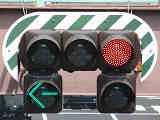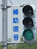 長崎県の予告信号は、「補助信号」の標示板が併設されています。交差点からかなり離れた位置でも、信号は交差点と同じサイクルです。(黄点滅のみのものもあります。)