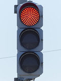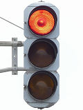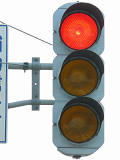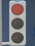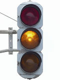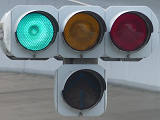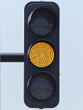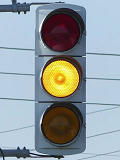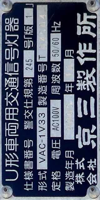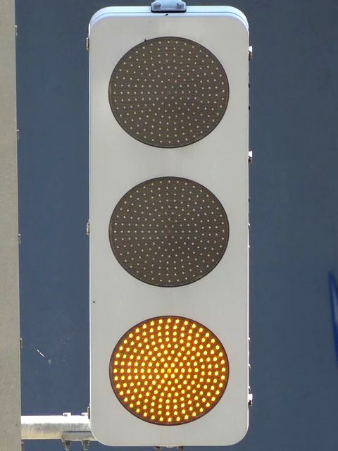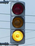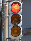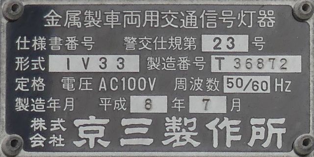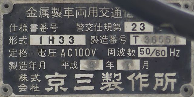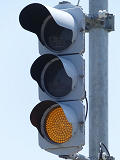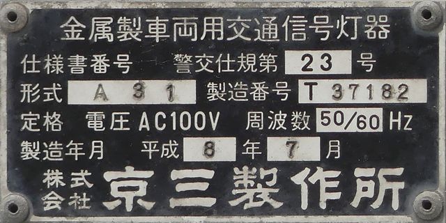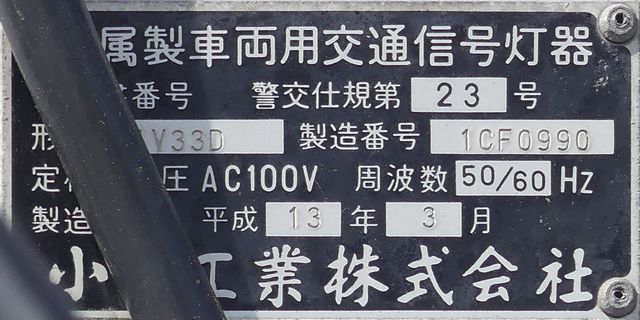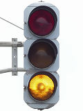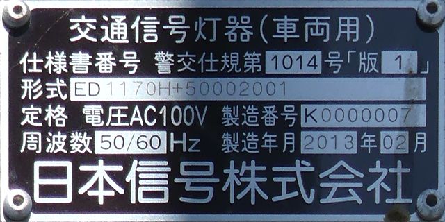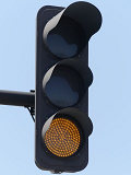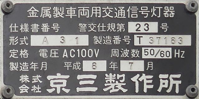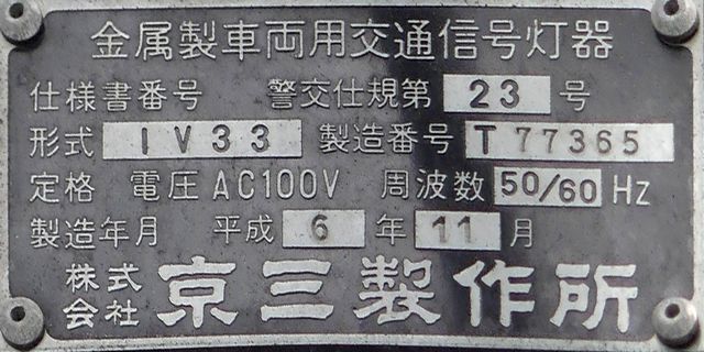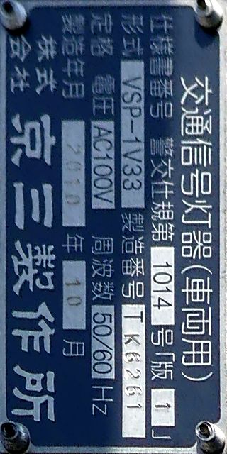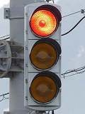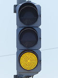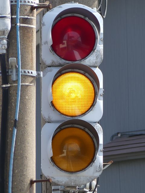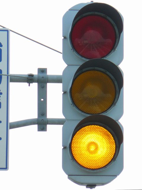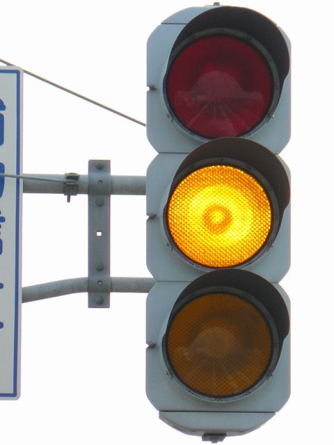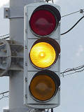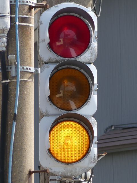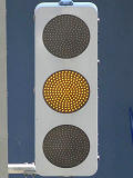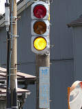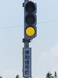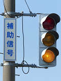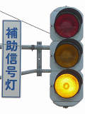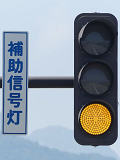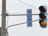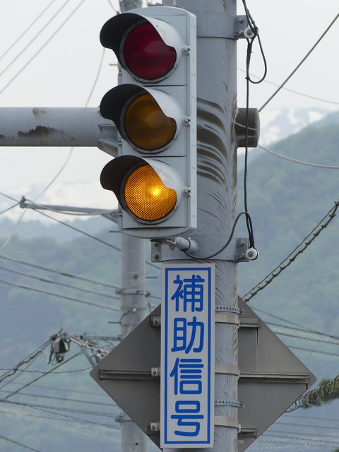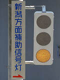 新潟県の標準的な予告信号変則灯器で、標示板は「補助信号灯」又は「補助信号」となっています。前方の信号が青のときに下黄が点滅し、黄、赤のときにはそれぞれが点灯します。なお、県内では3色信号に「補助信号灯」の標示板を設置して予告信号としている場合もあります。