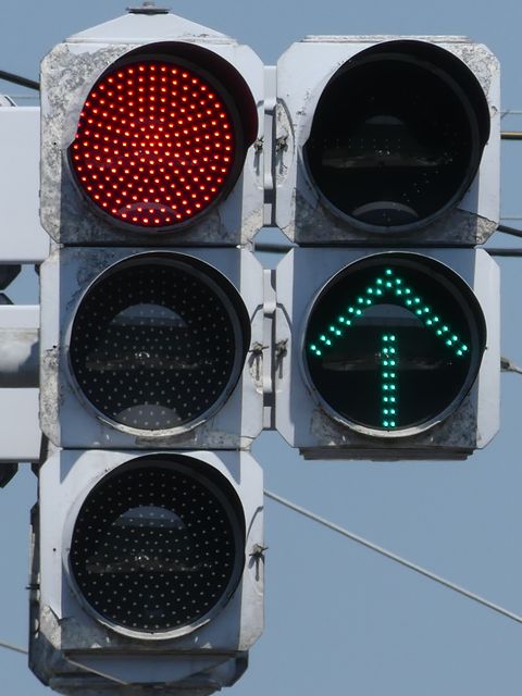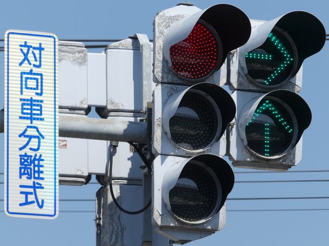 ムーブメント信号制御とは、交差点手前の感知器で感知した交通量に応じて、信号の時間や信号サイクルを変更し、渋滞を軽減するものです。この交差点では、基本は右折車分離式で、対向方向で交通量にあまり偏りがない場合は、滞留に応じて信号の時間の変更があるだけですが、対向方向で交通量に偏りがある場合は、交通量の少ない方を一旦赤信号として、交通量の多い方を全方向矢印信号により通行時間を延長し、その後双方の右折車を通行させます。