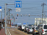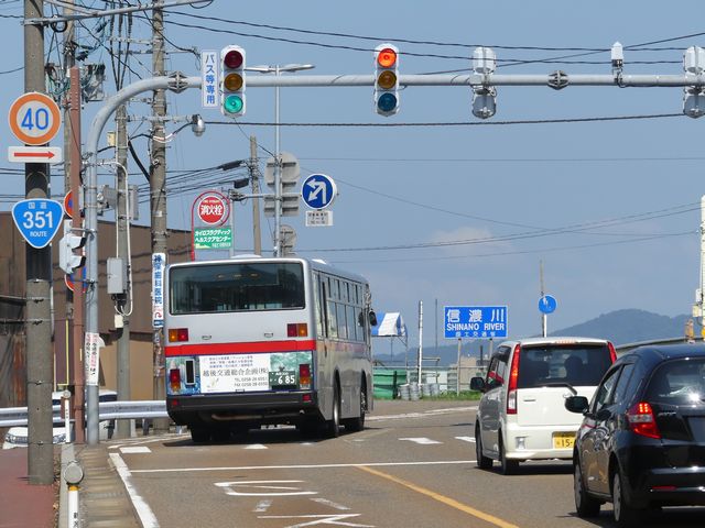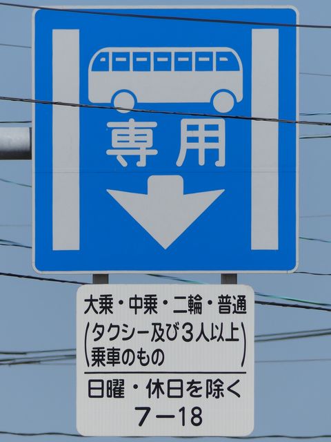 「バス等専用」という曖昧な表現の表示がされた標示板です。「○○等」といった表現は、法令等で定義がされていなければ使うことができません。ここの場合、第1通行帯の「専用通行帯」規制の対象車両(ただし、道路標識ページでコメントしているとおり補助標識の表記が不適当です。)を指しているのでしょうが、その場合、軽車両が対象になるかがわかりません。