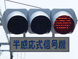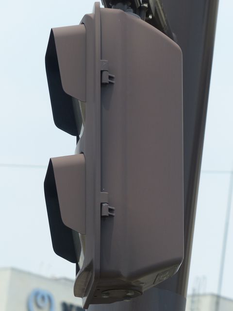 本線に平行する側道で、通常ならば誤認防止のために左右制限フードを使用しますが、ここでは道路の高さがわずかに違うことを利用しているのか距離制限(上下制限)フードを使用しています。