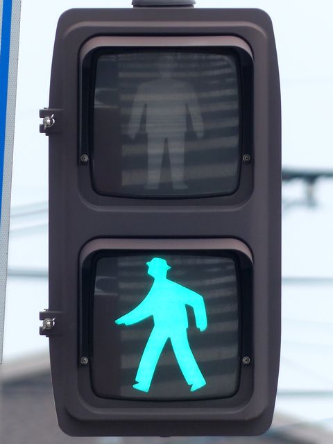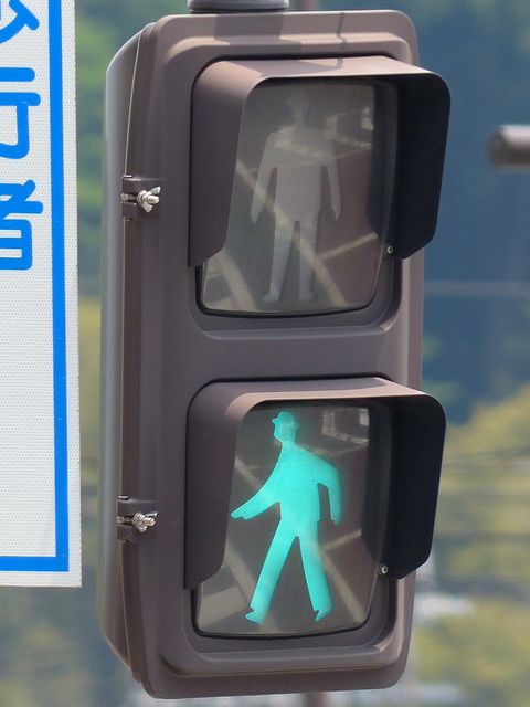車道ぎりぎりに歩行者灯器を設置するので、車両の接触防止のために通常より短いフードを使用しているようです。