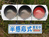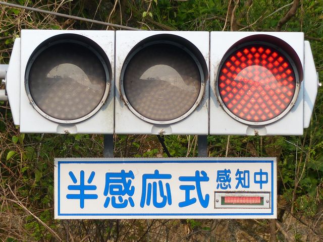 半感応式信号で、車両を感知すると「感知中」の下のLEDが赤く点灯します。大分県内の半感応式信号ではよく設置されています。