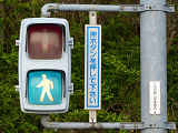 押ボタン式信号の歩行者用灯器に「押ボタンを押して下さい」の標示板が設置されていますが、小さいため横断距離が長い横断歩道では見えません。