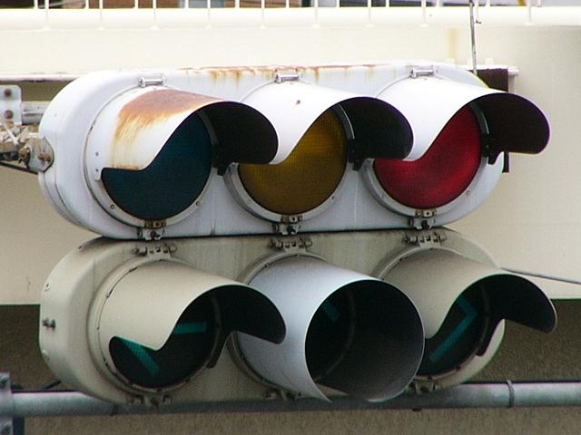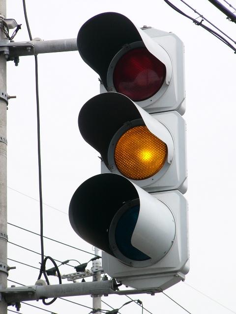 おそらく夜間に点滅動作になるのでしょう。その際、周辺の住宅に配慮するため、主道路(東西道路)の車灯の黄、従道路(南北道路)の車灯の赤のみが筒型のフードになっています。